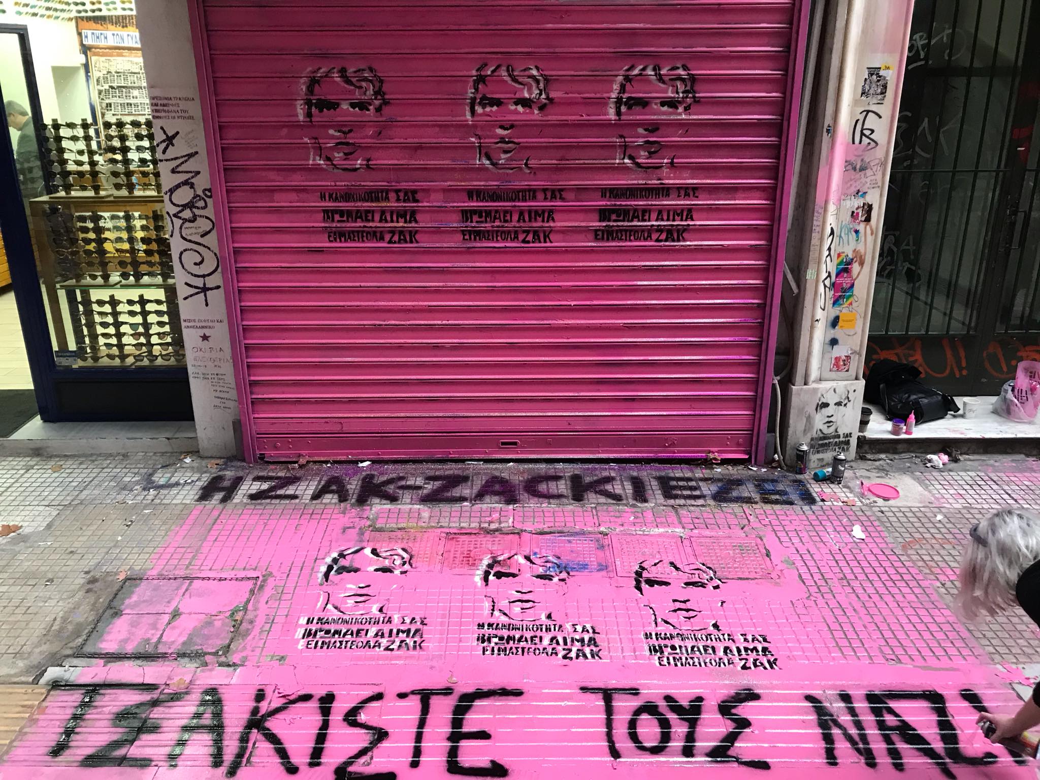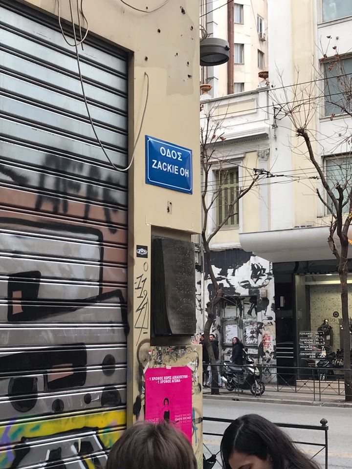 Εμείς δεν ξεχνάμε, ούτε θαμπωνόμαστε από το φωτισμό της πόλης. Ξέρουμε καλά ότι η Γλάδστωνος δε μας θέλει, γιατί ξύνουμε την ενοχή της και αποκαλύπτεται το υπόστρωμα μισανθρωπισμού της. Σ’ αυτή τη μικρή αποικία της βαρβαρότητας, όμως, έπεσε νεκρό ένα κομμάτι δικό μας, οπότε μας ανήκει και θα επιστρέφουμε πάντα για να το συναντήσουμε. Δε θα συμβιβαστούμε με την ύπαρξη χωρικών ζωνών αποκλεισμού μέσα στις πόλεις, ούτε θα περιστείλουμε το δικαίωμα μας να ζούμε όπως θέλουμε, όπου θέλουμε και με όποιους/ες θέλουμε. Γι’ αυτό σήμερα βάψαμε ροζ τα ρολά του κοσμηματοπωλείου για να ταιριάζουν με το κραγιόν της Zackie, φτιάξαμε στένσιλ με τη μορφή του Ζακ για να αφήσουμε ένα σημάδι ομορφιάς στην ασχήμια της κανονικότητας, δώσαμε στην οδό την ονομασία που της αξίζει, βάζοντας την ταμπέλα “Zackie Oh”, γιατί οι ονομασίες των δρόμων δεν αλλάζουν από τους δημάρχους της προνομιούχας ελίτ αλλά από τους ανθρώπους που ζουν και πεθαίνουν σε αυτούς.