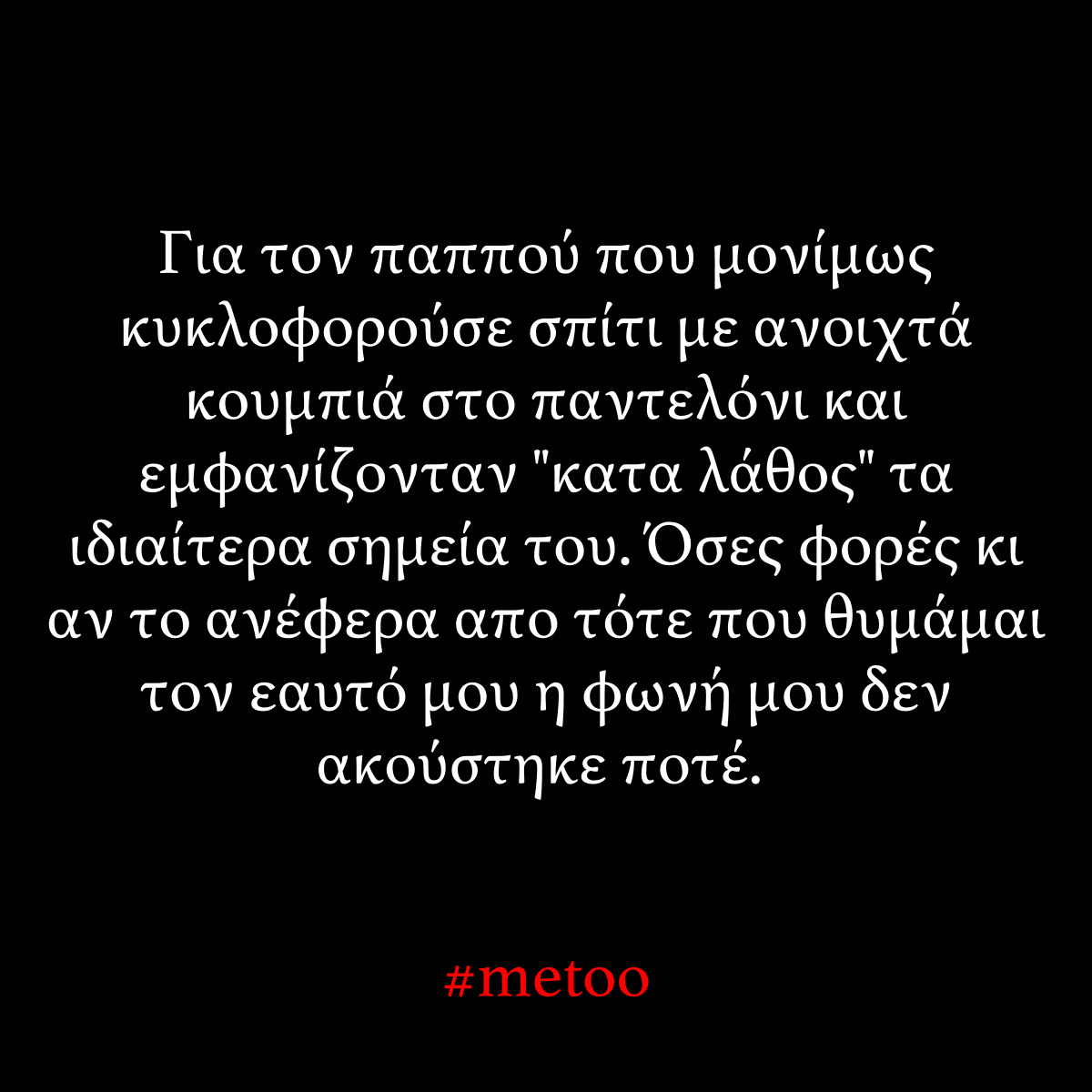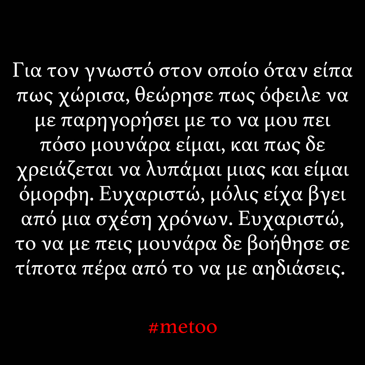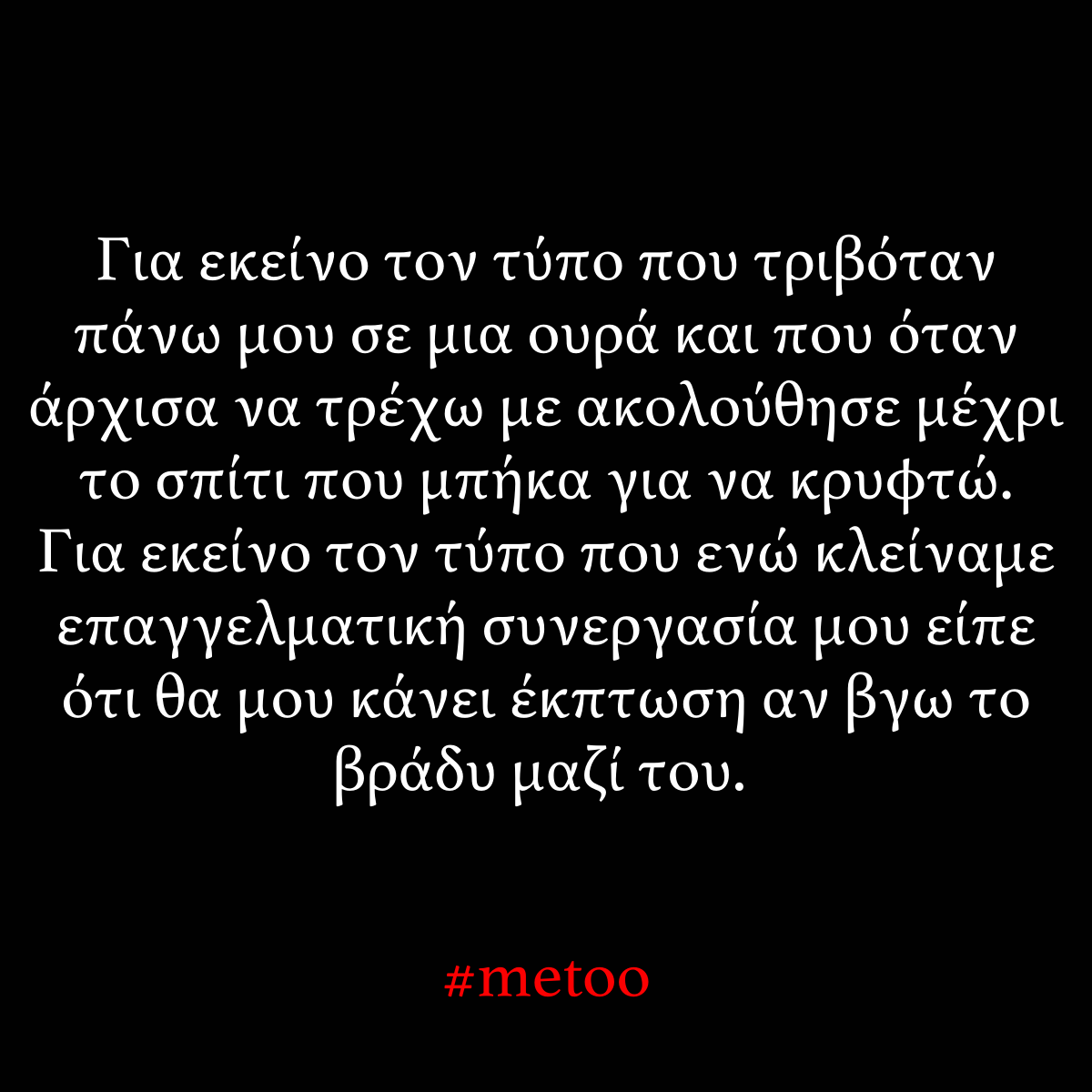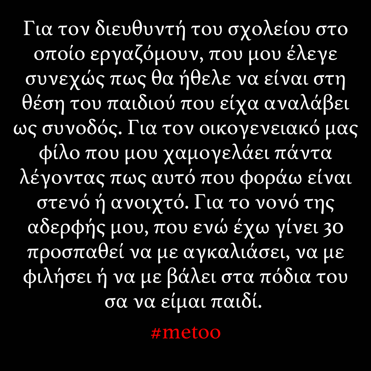 Τα μηνύματα που έλαβα ήταν αμέτρητα, από κοπέλες όλων των ηλικιών, και εξιστορούσαν περιστατικά λεκτικής και σωματικής βίας, εκφοβισμού, βιασμού, σεξουαλικής παρενόχλησης αλλά και παιδοφιλίας. Αποφάσισα να μη γράψω τίποτα. Οι κοπέλες που μίλησαν, στέλνοντας δεκάδες μηνύματα και ζητώντας να ακουστεί η φωνή τους, είναι τα μόνα λόγια που χρειάζεται να διαβάσει κανείς.