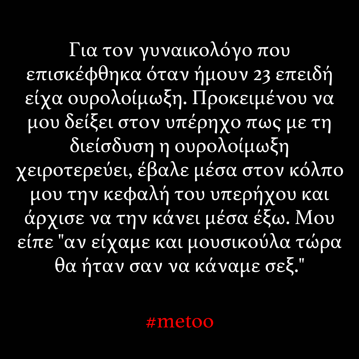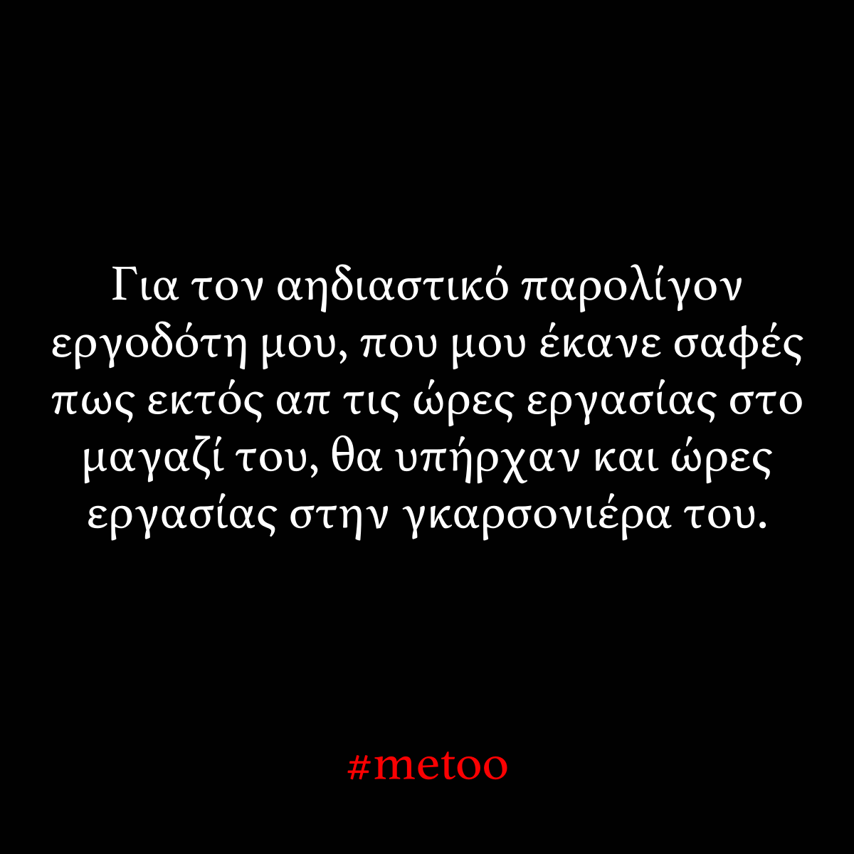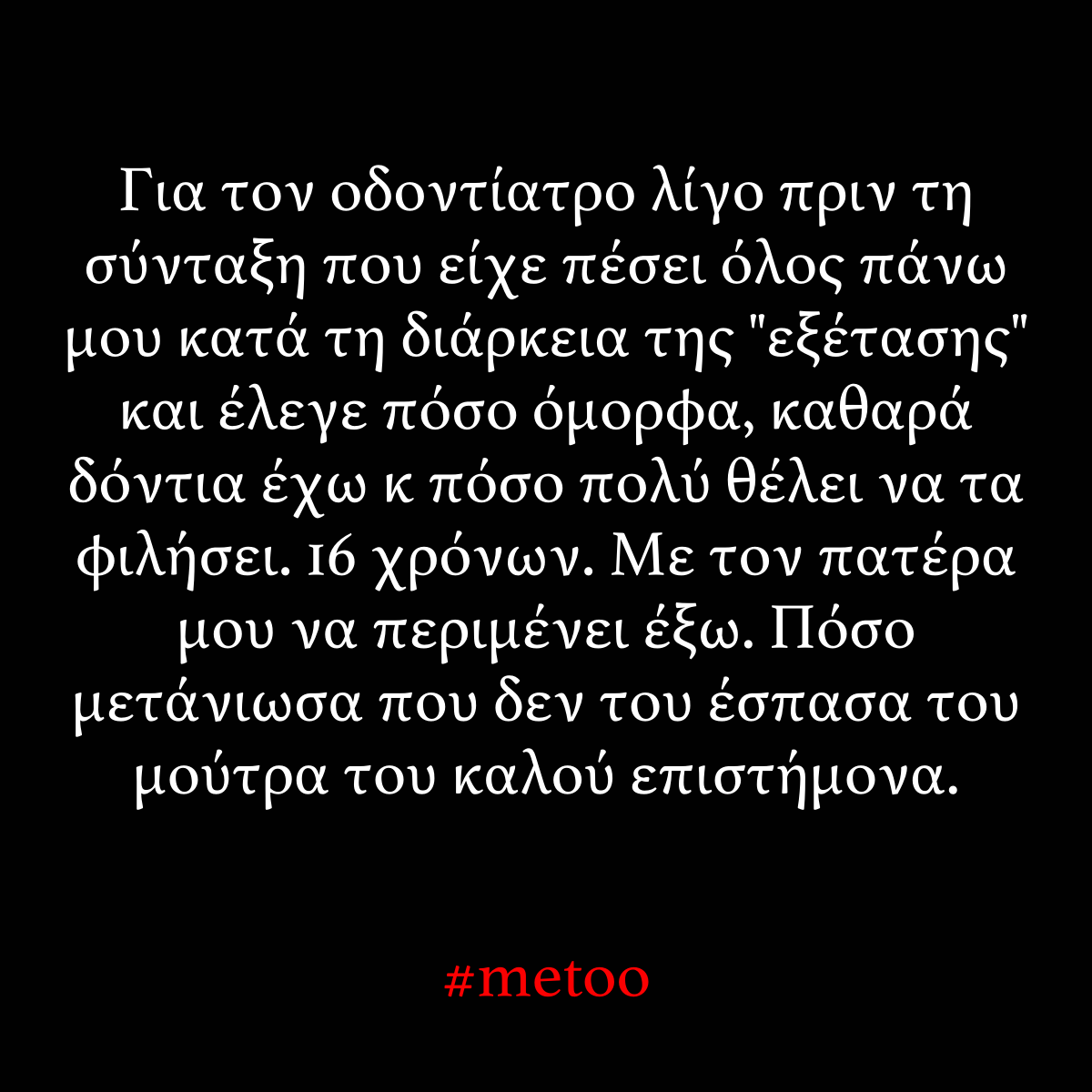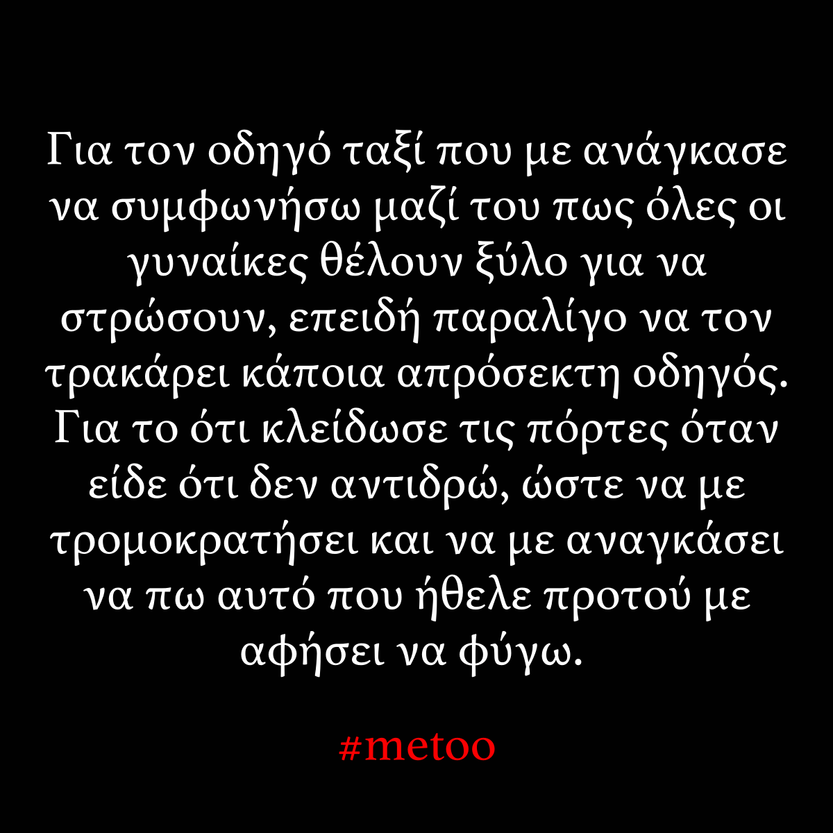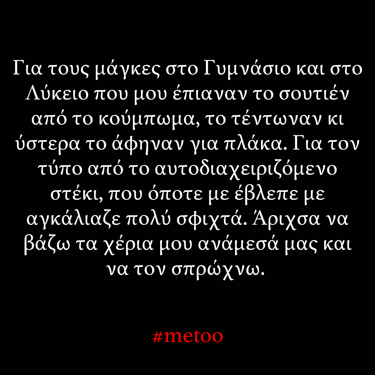 Τα μηνύματα που έλαβα ήταν αμέτρητα, από κοπέλες όλων των ηλικιών, και εξιστορούσαν περιστατικά λεκτικής και σωματικής βίας, εκφοβισμού, βιασμού, σεξουαλικής παρενόχλησης αλλά και παιδοφιλίας. Αποφάσισα να μη γράψω τίποτα. Οι κοπέλες που μίλησαν, στέλνοντας δεκάδες μηνύματα και ζητώντας να ακουστεί η φωνή τους, είναι τα μόνα λόγια που χρειάζεται να διαβάσει κανείς.