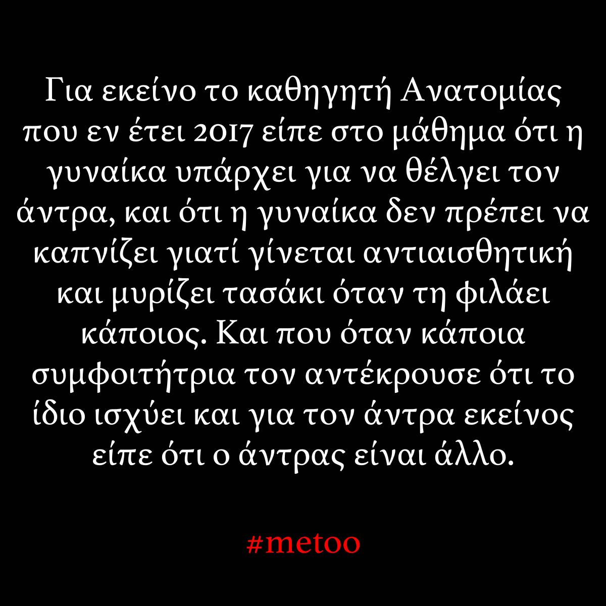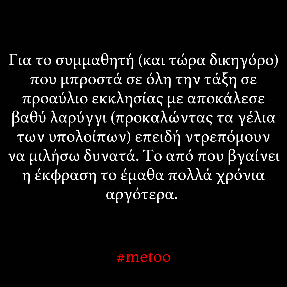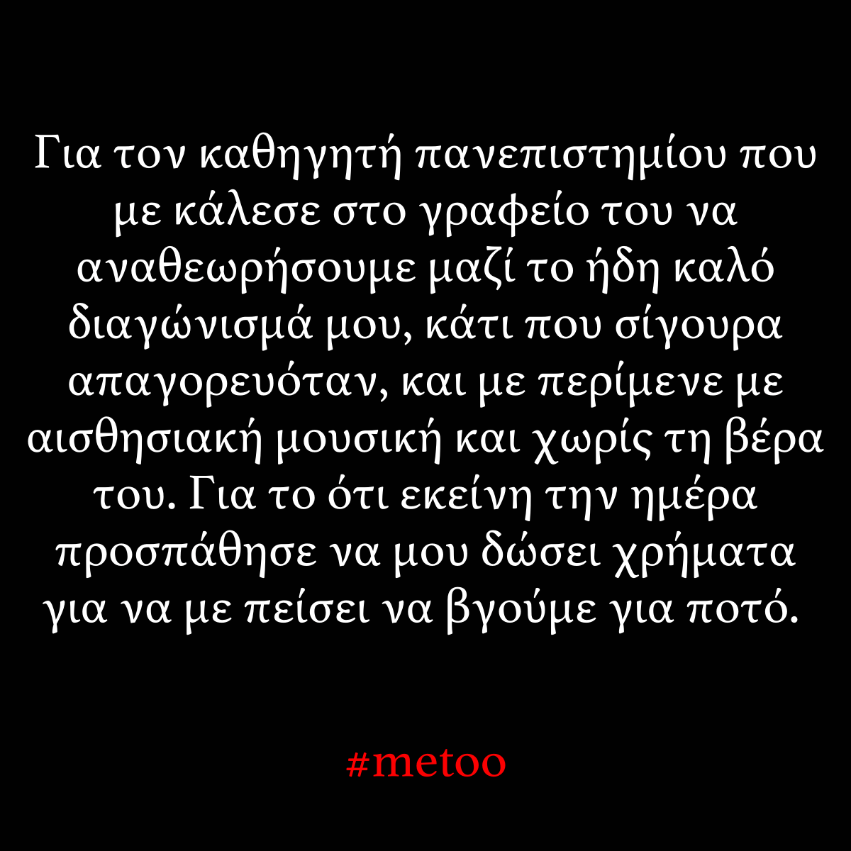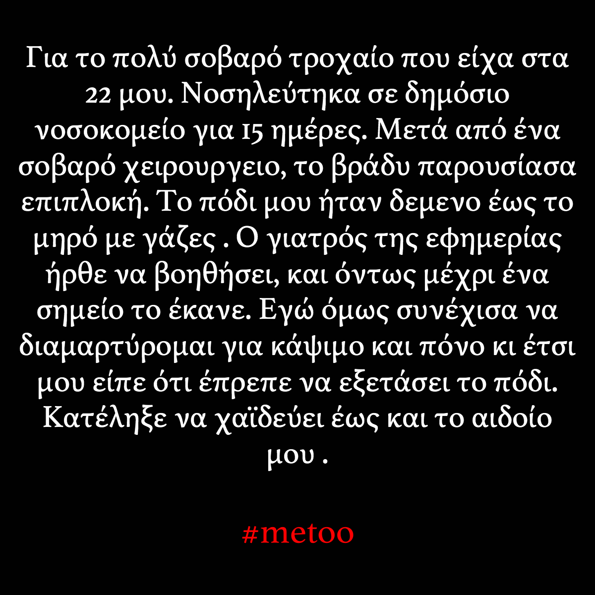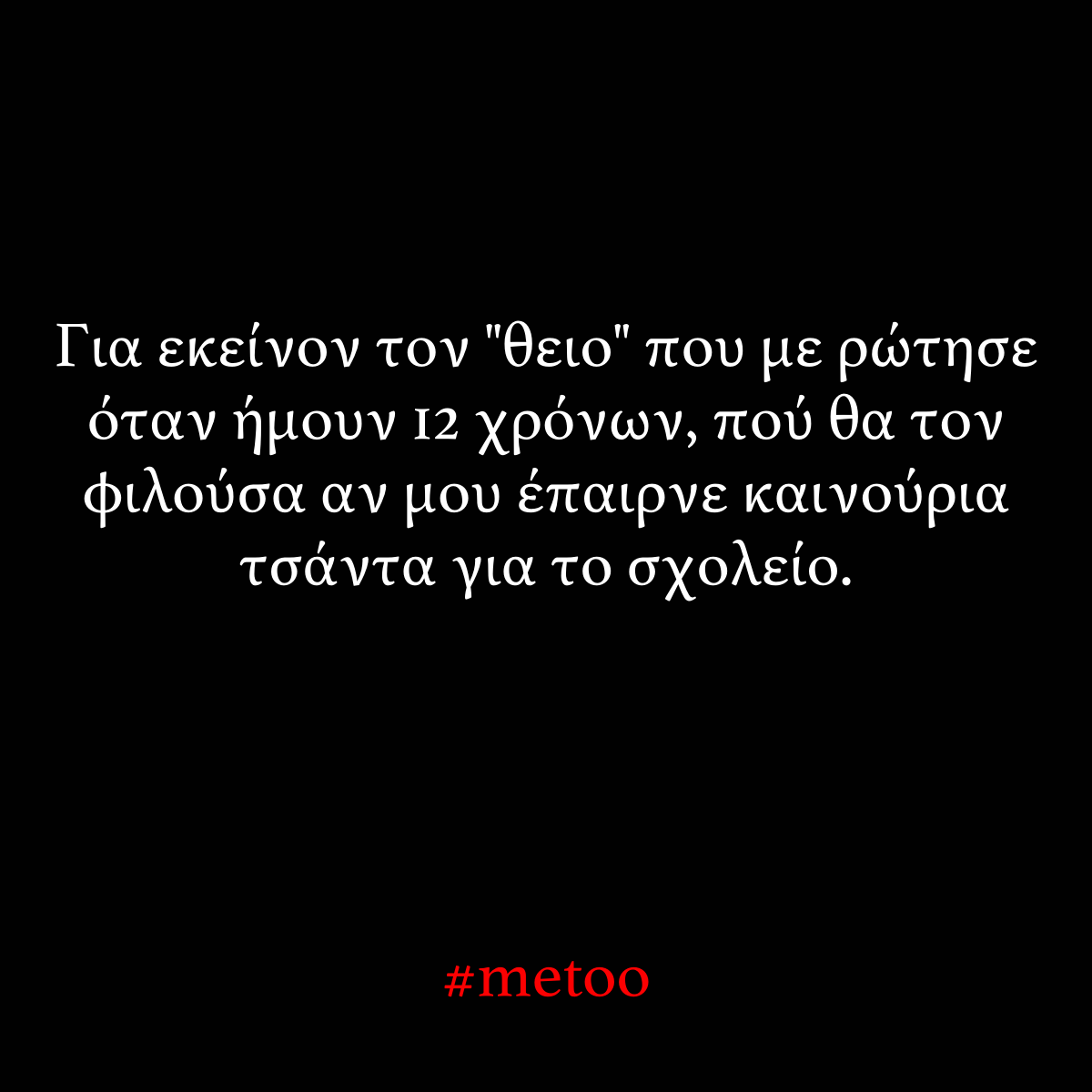 Τα μηνύματα που έλαβα ήταν αμέτρητα, από κοπέλες όλων των ηλικιών, και εξιστορούσαν περιστατικά λεκτικής και σωματικής βίας, εκφοβισμού, βιασμού, σεξουαλικής παρενόχλησης αλλά και παιδοφιλίας. Αποφάσισα να μη γράψω τίποτα. Οι κοπέλες που μίλησαν, στέλνοντας δεκάδες μηνύματα και ζητώντας να ακουστεί η φωνή τους, είναι τα μόνα λόγια που χρειάζεται να διαβάσει κανείς.