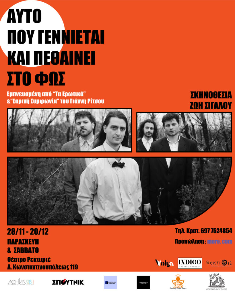 Μια πρωτότυπη θεατρική σύνθεση βασισμένη στην Εαρινή Συμφωνία και τα Ερωτικά του Γιάννη Ρίτσου, από τις 28 Νοεμβρίου,για 8 μόνο παραστάσεις η ομάδα Volya παρουσιάζει την παράσταση «Αυτό που γεννιέται και πεθαίνει στο φως» στο θέατρο Ρεκτιφιέ.