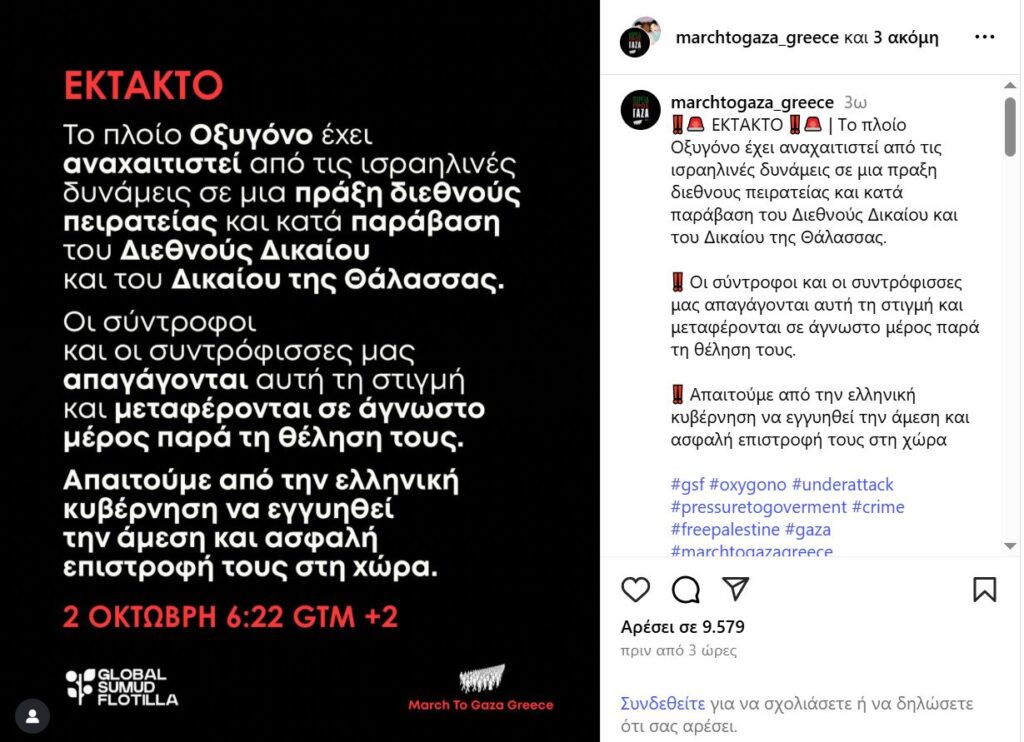 Όπως αναφέρει στα μέσα κοινωνικής δικτύωσης ο λογαριασμός March to Gaza Greece, «το πλοίο Οξυγόνο έχει αναχαιτιστεί από τις ισραηλινές δυνάμεις σε μια πράξη διεθνούς πειρατείας και κατά παράβαση του Διεθνούς Δικαίου και του Δικαίου της Θάλασσας.