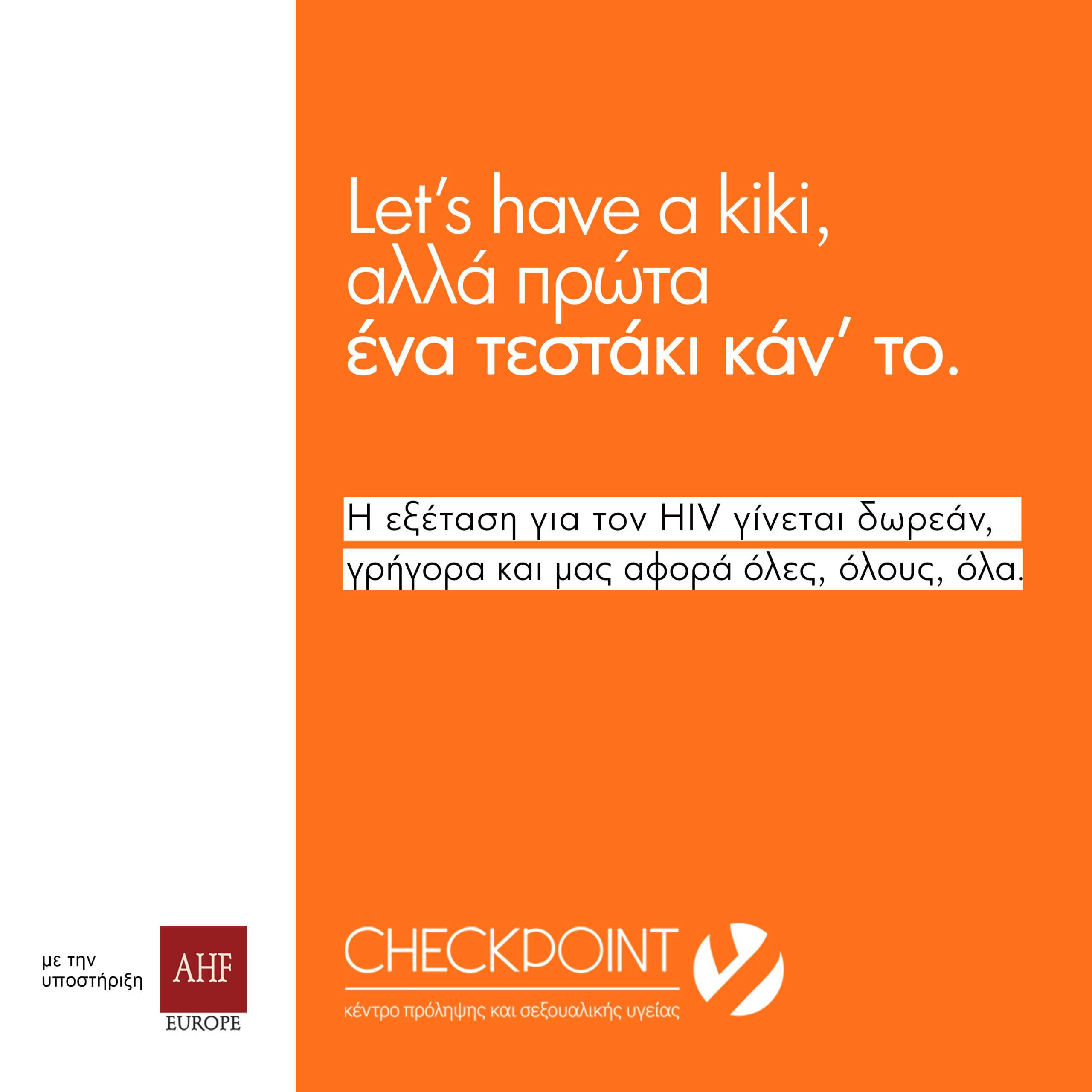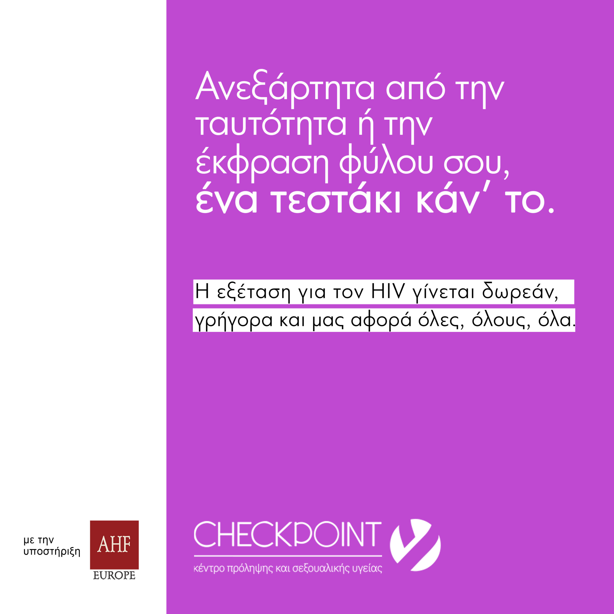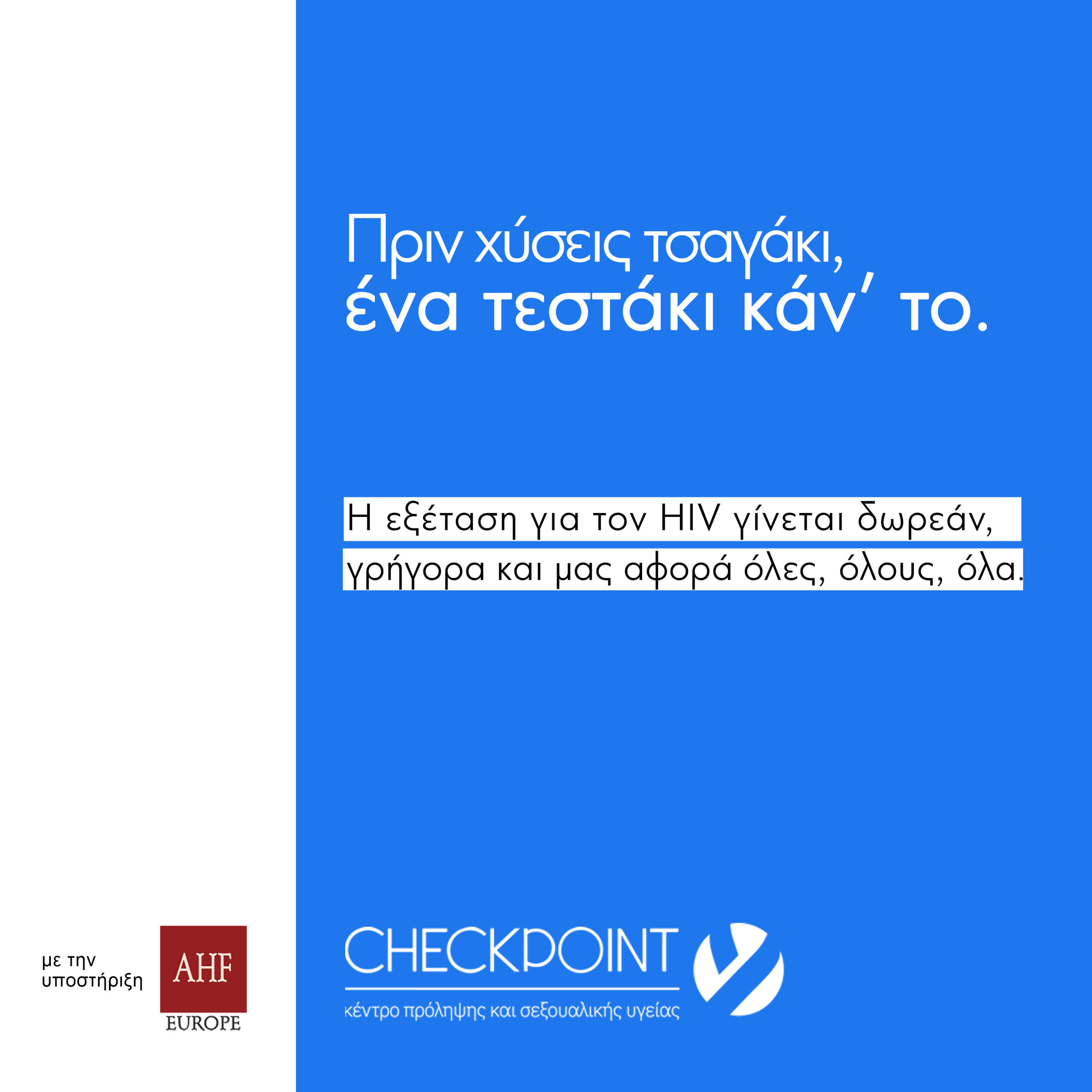 Στο Athens Checkpoint (Πιττάκη 4, 1ος όροφος) και στο Thessaloniki Checkpoint (Εγνατία 112, 3ος όροφος), η εξέταση γίνεται δωρεάν και το αποτέλεσμα λαμβάνεται εντός μερικών λεπτών, ενώ μπορεί να συνδυαστεί με συμβουλευτική για θέματα σεξουαλικής υγείας και με διασύνδεση με το Εθνικό Σύστημα Υγείας, σε περίπτωση αντιδρώντος (θετικού) αποτελέσματος. Επιπλέον, η νέα καμπάνια υπενθυμίζει πως, παρόλο που πρόκειται για μια πολύ απλή διαδικασία, η εξέταση για τον HIV είναι εξαιρετικά σημαντική και αφορά κάθε σεξουαλικά ενεργό άτομο.