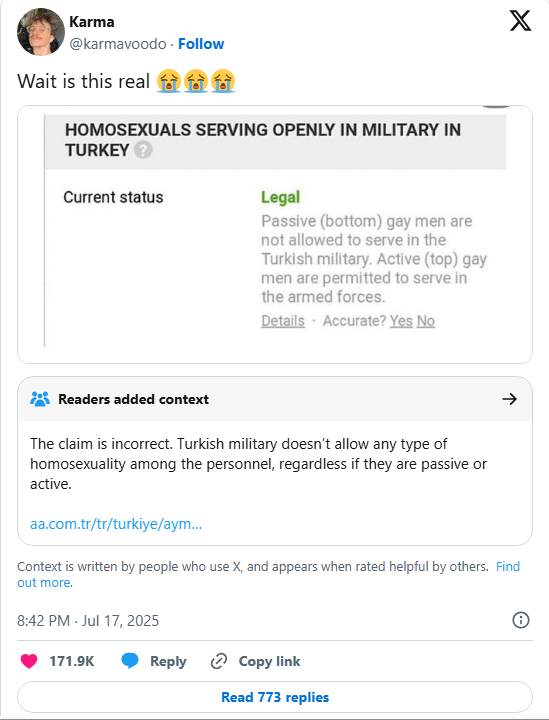 Στους κόλπους του τουρκικού στρατού η ομοφυλοφιλία θεωρείται «αρρώστια». Στα στρατιωτικά αρχεία οι ομοφυλόφιλοι καταχωρίζονται στην ίδια κατηγορία με τους ανάπηρους και τους πάσχοντες από ανίατες ασθένειες. Έντονες αντιδράσεις στην ευρωπαϊκή και διεθνή κοινή γνώμη είχε προκαλέσει η δήλωση της υπουργού Οικογενειακών Υποθέσεων Selma Aliye Kavaf το 2010 ότι η ομοφυλοφιλία αποτελεί «βιολογική αποτυχία».