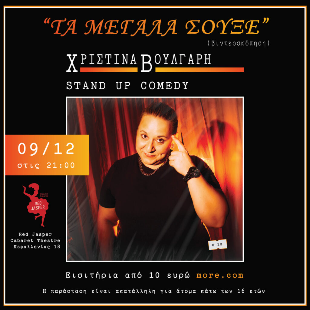 Μετά από πέντε χρόνια αδιάκοπης παρουσίας στην κωμική σκηνή της Αθήνας, η Χριστίνα Βούλγαρη έρχεται δυναμικά με ένα εγχείρημα που σηματοδοτεί ένα νέο κεφάλαιο στην μέχρι τώρα πορεία της. Έχοντας μοιράσει γέλια σε δεκάδες σκηνές και παραστάσεις, αποφασίζει να συγκεντρώσει όλο της το υλικό, τις πιο αγαπημένες της στιγμές και τα πιο απρόβλεπτα αστεία σε μία μοναδική βραδιά στο Red Jasper Cabaret Theatre.