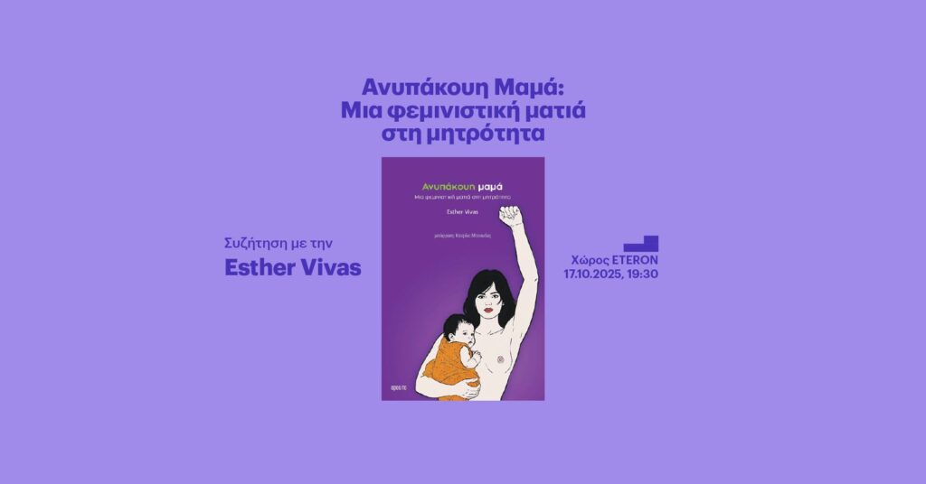 Με αφορμή την έκδοση του βιβλίου «Ανυπάκουη Μαμά: Μια φεμινιστική ματιά στη μητρότητα», οι εκδόσεις oposito σας προσκαλούν στην ομιλία/συζήτηση με την συγγράφισσα Esther Vivas.