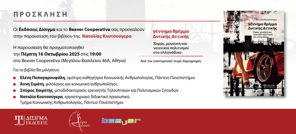 Οι Εκδόσεις Δίσιγμα και το Beaver Cooperativa σας προσκαλούν στην παρουσίαση του βιβλίου της Ναταλίας Κουτσούγερα «Γέννημα θρέμμα Δυτικής Αττικής: Χορός, μουσική και νεανικοί πολιτισμοί στο ελληνάδικο» την Πέμπτη 16 Οκτωβρίου 2025 στις 19:00 στο Beaver Cooperativa.