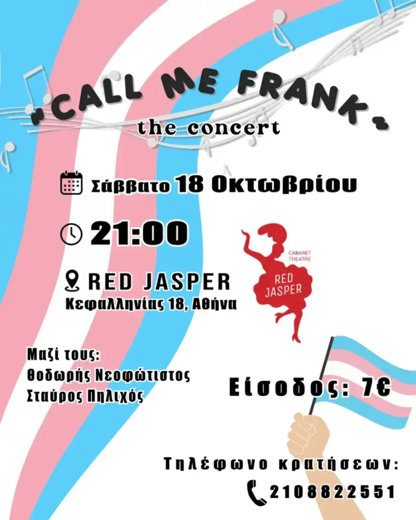 Το “Call Me Frank” είναι μια σειρά συναυλιών, που αποσκοπεί στην κάλυψη των εξόδων της φυλομετάβασης του Φρανκ Αξαόπουλου, ενός 22άχρονου τρανς άντρα από την Αθήνα.
