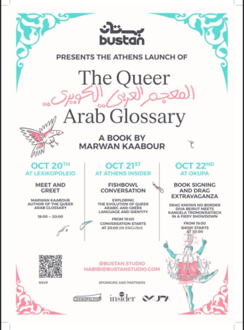 Ο πολιτιστικός και δημιουργικός συμβουλευτικός οργανισμός Bustan έχει τη χαρά να παρουσιάσει για πρώτη φορά στην Αθήνα το “The Queer Arab Glossary” του καλλιτέχνη, σχεδιαστή και ερευνητή Marwan Kaabour, μέσα από ένα τριήμερο πρόγραμμα αφιερωμένο στη γλώσσα, την ταυτότητα και τον διαπολιτισμικό διάλογο ανάμεσα στον αραβικό κόσμο και την Ελλάδα. Μετά από επιτυχημένες παρουσιάσεις σε Βηρυτό, Βερολίνο, Νέα Υόρκη, Όσλο και αλλού, το “Queer Arab Glossary” φτάνει στην Αθήνα, για να εξερευνήσει το γλωσσικό τοπίο της queer ζωής μέσα από τις ποικίλες αραβικές διαλέκτους. Το βιβλίο συγκεντρώνει εκατοντάδες καθομιλούμενες λέξεις και εκφράσεις από διάφορες περιοχές του αραβόφωνου κόσμου, παρουσιάζοντάς τες μέσα από μια ιδιαίτερη εικαστική γλώσσα. Με παιχνιδιάρικο αλλά και προσεγμένο σχεδιασμό, αποκαλύπτει πώς η αργκό και η κωδικοποιημένη γλώσσα εξελίχθηκαν σε εργαλεία οικειότητας, ανθεκτικότητας και χαράς. Μέσα από εκδηλώσεις που συνδυάζουν τη θεωρία, την περφόρμανς και την κοινότητα, η αθηναϊκή παρουσίαση συνεχίζει την αποστολή του Bustan: Να γεφυρώνει τον δημιουργικό κόσμο της Ανατολικής Μεσογείου με το διεθνές πολιτιστικό πεδίο.