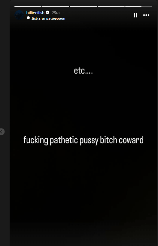 Συγκεκριμένα, η Eilish τον χαρακτήρισε «αξιοθρήνητο» και «δειλό», γράφοντας στο Story: «fucking pathetic pussy bitch coward».