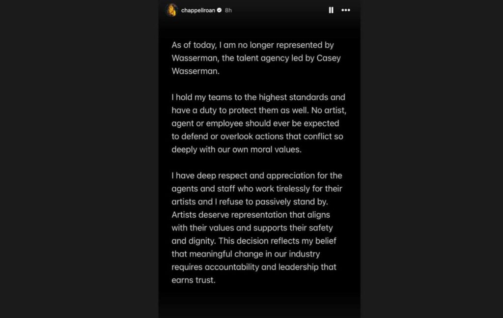 Στη δήλωσή της, η Roan συνέχισε λέγοντας ότι έχει «βαθύ σεβασμό και εκτίμηση» για τους ατζέντες που εργάζονται «ακούραστα» για τους καλλιτέχνες τους, προσθέτοντας: «Αρνούμαι να παραμείνω παθητική».
