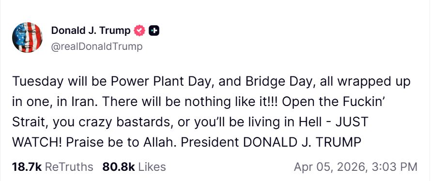 «Η Τρίτη θα είναι η Ημέρα του Εργοστασίου Παραγωγής Ηλεκτρικής Ενέργειας και η Ημέρα της Γέφυρας, όλα σε ένα, στο Ιράν. Δεν θα υπάρχει τίποτα παρόμοιο!!! Ανοίξτε το γαμημένο στενό, τρελοί μπάσταρδοι, αλλιώς θα ζήσετε μια κόλαση – ΑΠΛΆ ΠΑΡΑΚΟΛΟΥΘΗΣΤΕ! Δόξα στον Αλλάχ. Πρόεδρος ΝΤΟΝΑΛΝΤ ΤΡΑΜΠ», έγραψε.