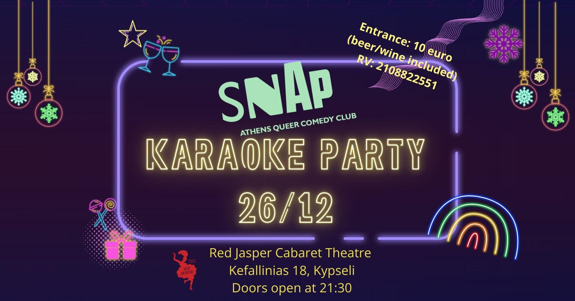 “Χριστούγεννα, Γκλίτερ, Παγιέτες, Τραγούδι και Χορός! Ένα ακόμα επικό καραόκε του Snap έρχεται την Παρασκευή 26 Δεκεμβρίου στο Red Jasper Cabaret Theatre! Ελάτε να αποχαιρετήσουμε το 2025 παρέα με κέφι και τραγούδι! Παρασκευή 26 Δεκεμβρίου. Οι πόρτες ανοίγουν στις 9.30μμ. Γενική είσοδος 10 ευρώ με μπίρα ή κρασί. Red Jasper Cabaret Theatre, Κεφαλληνίας 18″.