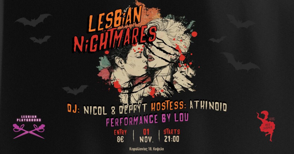 Το Lesbian Playground επιστρέφει δυναμικά με μια βραδιά που θα μας στοιχειώσει … με τον πιο απολαυστικό τρόπο! Μετά το επικό “Dykes and Bears”, ετοιμαστείτε για το απόλυτο Halloween Party της χρονιάς: Lesbian Nightmares. Το Σάββατο 1η Νοεμβρίου, το Red Jasper Cabaret Theatre μεταμορφώνεται σε ένα σκοτεινό, queer καταφύγιο γεμάτο μάγισσες, φαντάσματα, βαμπίρ, δαίμονες και κάθε λογής πλάσματα της νύχτας που αγαπούν την διασκέδαση και την ελευθερία.