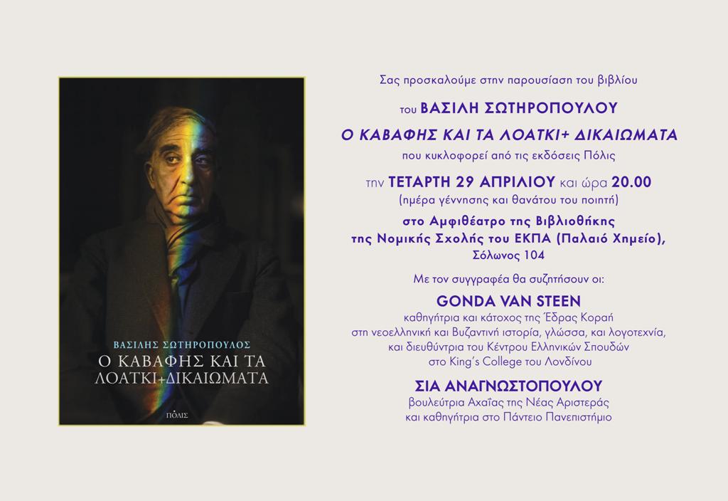 Την Τετάρτη 29 Απριλίου στο Παλαιό Χημείο θα πραγματοποιηθεί παρουσίαση του βιβλίου του Βασίλη Σωτηρόπουλου «Ο Καβάφης και τα ΛΟΑΤΚΙ+ δικαιώματα» που κυκλοφορεί από τις εκδόσεις ΠOΛΙΣ στις 20:00 [ημέρα γέννησης και θανάτου του ποιητή].
