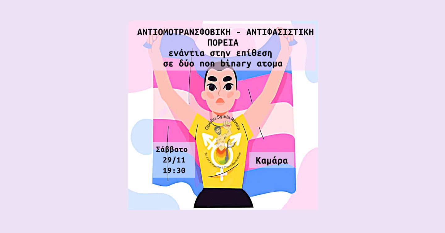Σύμφωνα με καταγγελία της ομάδας Sylvia Rivera, «χθες το βράδυ δύο non binary άτομα δέχτηκαν επίμονη λεκτική ομοτρανσφοβική επίθεση από τουλάχιστον 7-8 ανήλικους φασίστες υποστηρικτές της Χρυσής Αυγής».