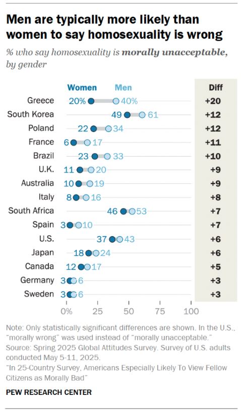 Οι άνδρες είναι πιο πιθανό από τις γυναίκες να πουν ότι η ομοφυλοφιλία είναι λάθος, με το 40% των ανδρών στην Ελλάδα να υιοθετεί αυτήν τη θέση σε αντίθεση με το 20% των γυναικών.