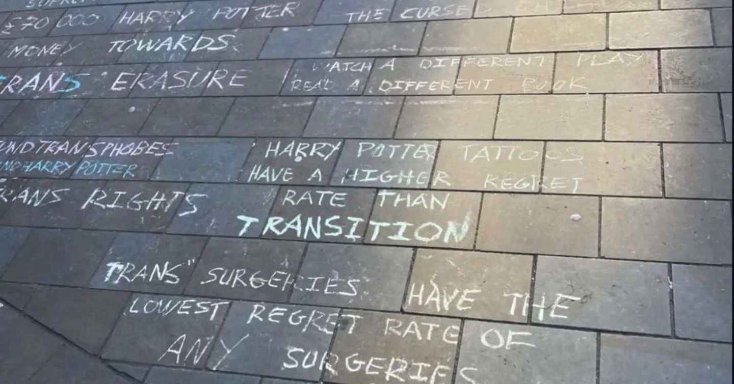 Τρανς άτομα έγραψαν εκατοντάδες μηνύματα με κιμωλία στον δρόμο κατά της Τζ. Κ. Ρόουλινγκ, κατά τη διάρκεια μιας παράστασης του «Χάρι Πότερ και το Καταραμένο Παιδί».