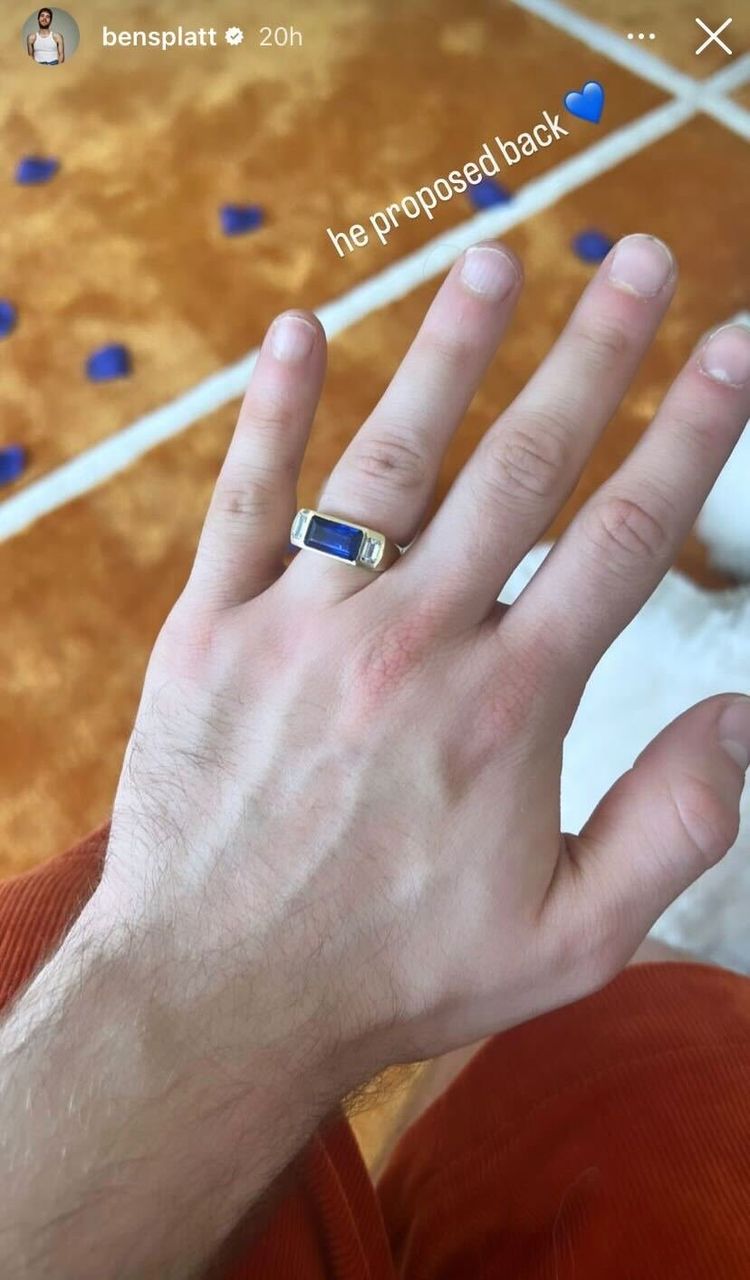 «Μου έκανε πρόταση γάμου και εκείνος», έγραψε ο Platt σε ένα story στο Instagram του τη Δευτέρα 29 Μαΐου μαζί με μια φωτογραφία που δείχνει το νέο του δαχτυλίδι αρραβώνων με ζαφείρι που ταιριάζει με αυτό που έδωσε στον Galvin πέρυσι.