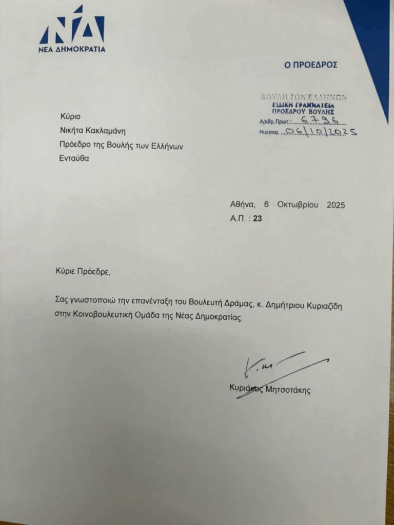 Στην Κοινοβουλευτική Ομάδα της Νέας Δημοκρατίας επανεντάχθηκε ο βουλευτής Δημήτρης Κυριαζίδης, μετά τη διαγραφή του για το έντονα σεξιστικό του σχόλιο προς την πρόεδρο της Πλεύσης Ελευθερίας, Ζωής Κωνσταντοπούλου.