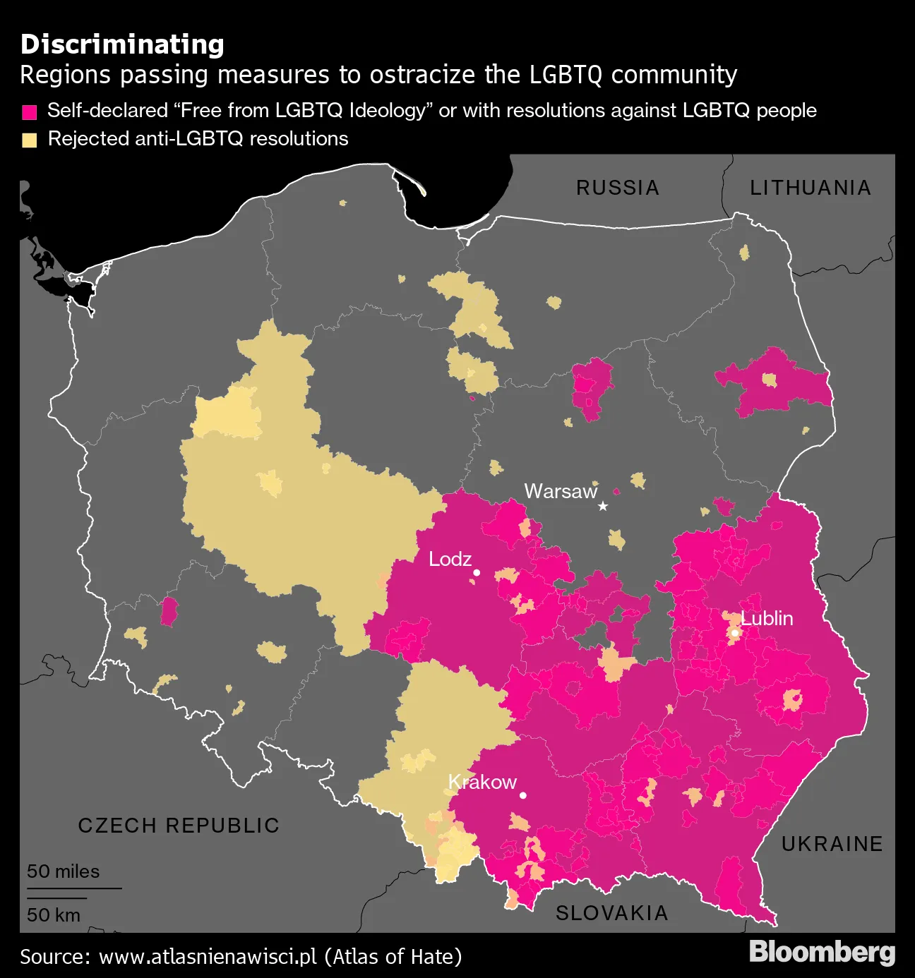 Την περίοδο 2019–2020, περισσότερες από 100 τοπικές αρχές στην Πολωνία υιοθέτησαν ψηφίσματα κατά των ΛΟΑΤΚΙ+. Κάποιες αυτοανακηρύχθηκαν «ελεύθερες από την ιδεολογία των ΛΟΑΤ+», ενώ οι περισσότερες ενέκριναν «Χάρτες Δικαιωμάτων της Οικογένειας», που όριζαν τον γάμο αποκλειστικά μεταξύ άνδρα και γυναίκας και δεσμεύονταν να «προστατεύσουν τα παιδιά από την ηθική διαφθορά».