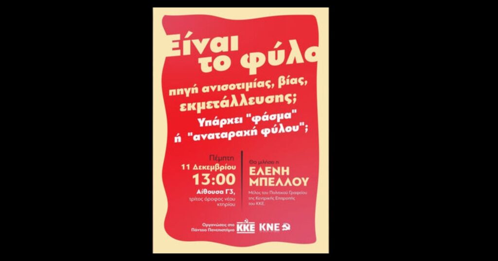 Με τίτλο «Είναι το φύλο πηγή ανισοτιμίας, βίας, εκμετάλλευσης; Υπάρχει φάσμα ή αναταραχή φύλου;», η εκδήλωση θα πραγματοποιηθεί σήμερα στην Αίθουσα Γ3 του νέου κτηρίου στο Πάντειο με μία και μοναδική ομιλήτρια. Η Ελένη Μπέλλου είναι μέρος του ΠΓ της ΚΕ του ΚΚΕ και σε ένα από τα κείμενά της στο ΚΟΜΕΠ φαίνεται η αντιεπιστημονική και προβληματική στάση της απέναντι στα τρανς και κουήρ ζητήματα.