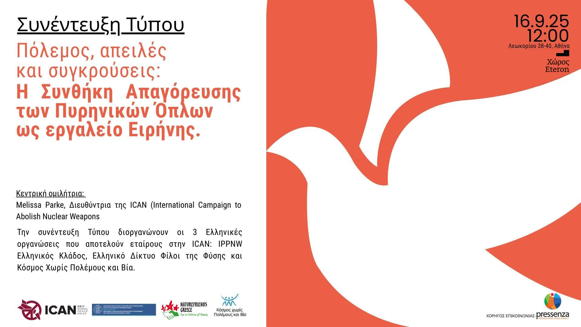 Την συνέντευξη Τύπου διοργανώνουν οι 3 Ελληνικές οργανώσεις που αποτελούν εταίρους στην ICAN: IPPNW Ελληνικός Κλάδος, Ελληνικό Δίκτυο Φίλοι της Φύσης και Κόσμος Χωρίς Πολέμους και Βία.