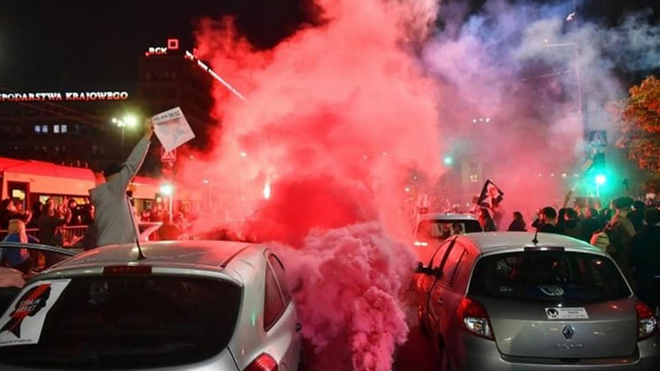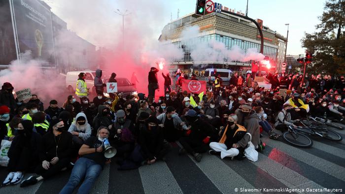 Χιλιάδες διαδηλώτριες/τές μπλοκάρουν δεκάδες δρόμους σε ολόκληρη την Πολωνία για πέμπτη συνεχόμενη ημέρα, για το νόμο κατά των αμβλώσεων μετά από δικαστική απόφαση που αποκλείει την άμβλωση.