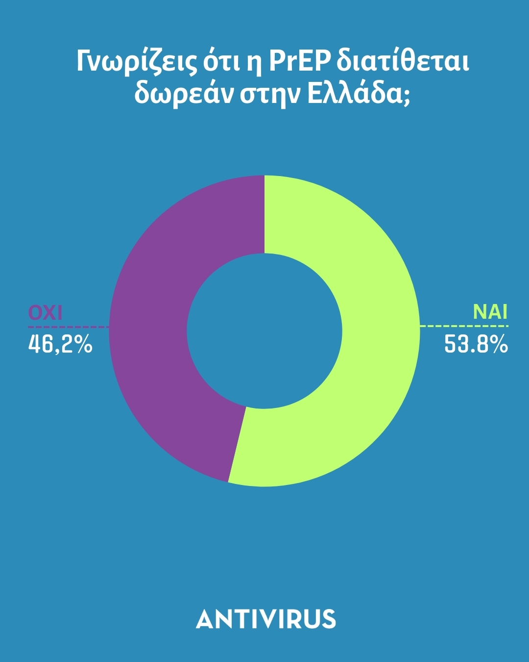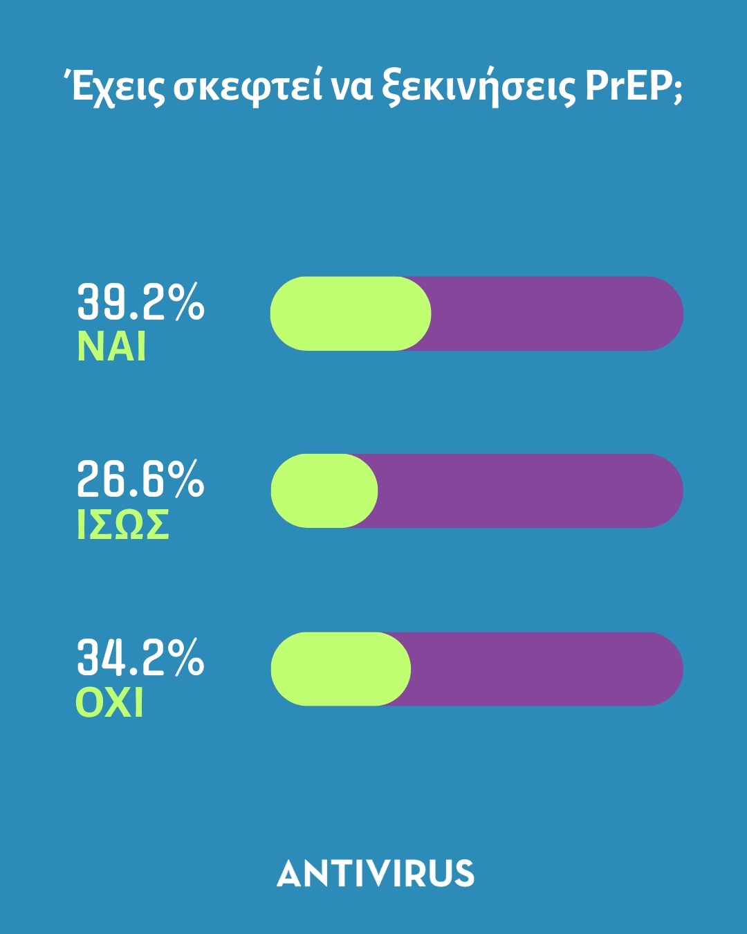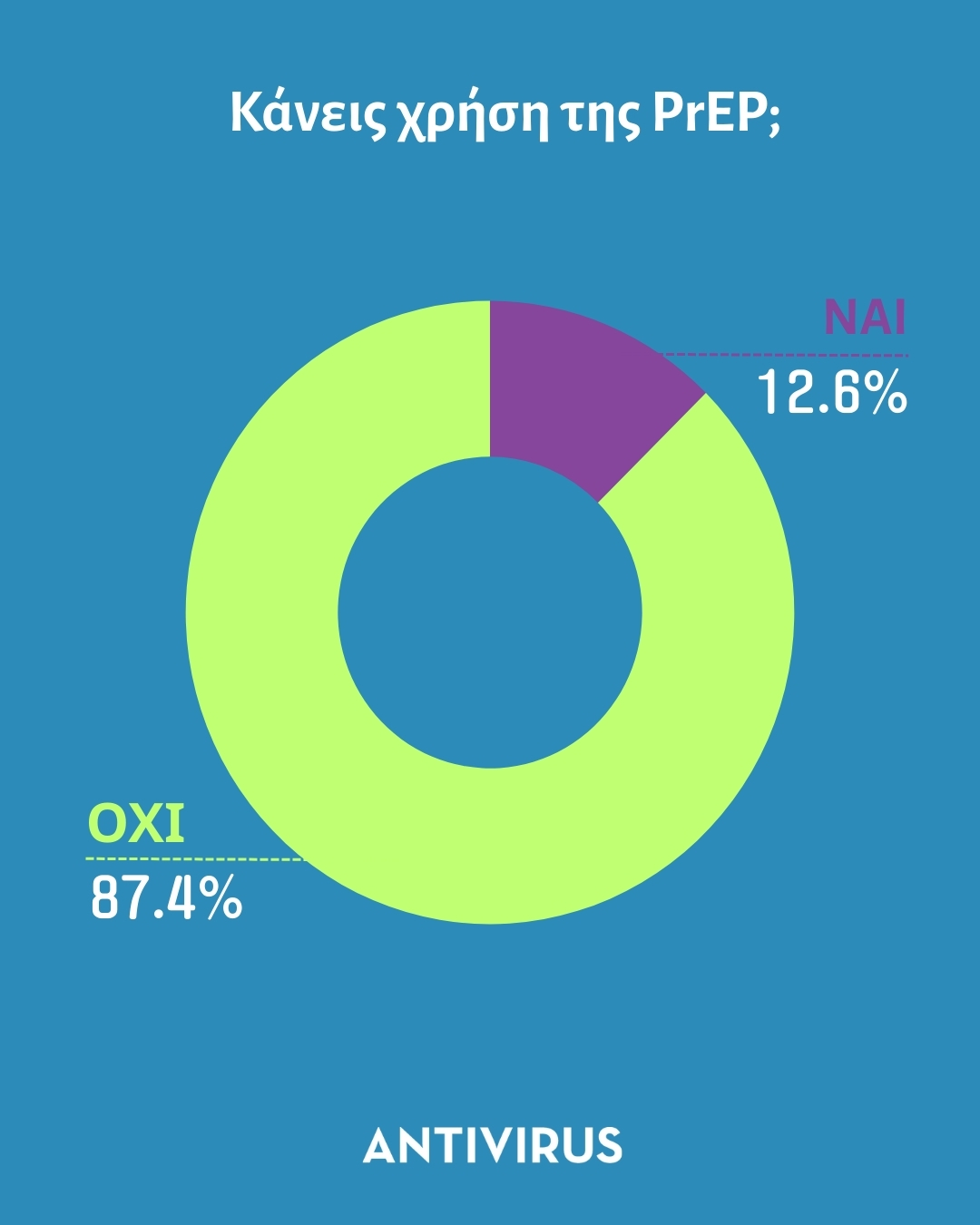 Η χρήση της PrEP στην Ελλάδα παραμένει χαμηλή, με μόλις 12,6% των ερωτηθέντων να δηλώνουν ότι την χρησιμοποιούν. Τα στοιχεία δείχνουν σημαντικό περιθώριο ενίσχυσης της ενημέρωσης και της πρόσβασης, με ιδιαίτερη σημασία στην πληροφόρηση ότι η αγωγή παρέχεται δωρεάν.