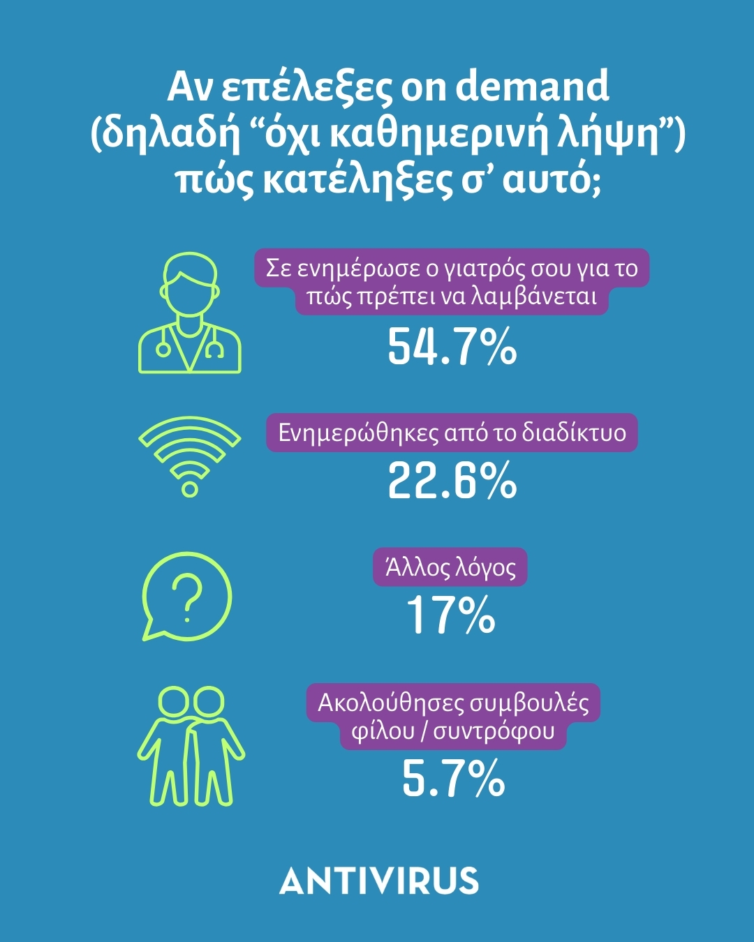 Για όσα άτομα επιλέγουν το on-demand σχήμα PrEP, η ιατρική καθοδήγηση παραμένει κρίσιμη, με το 54,7% να δηλώνει τον γιατρό ως κύρια πηγή ενημέρωσης. Η πληροφόρηση μέσω διαδικτύου λειτουργεί συμπληρωματικά, χωρίς να αντικαθιστά την ιατρική συμβουλή.