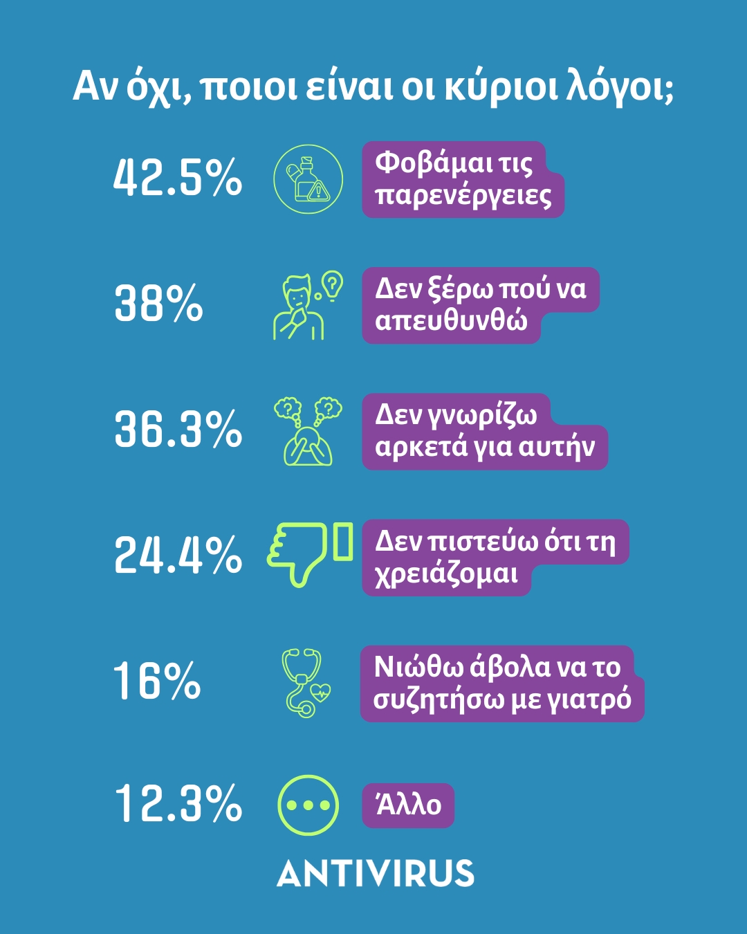 Τα κυριότερα εμπόδια για τη μη έναρξη της PrEP είναι οι παρενέργειες (42,5%), η άγνοια για το πού να απευθυνθούν (38%) και η έλλειψη γνώσης για την ίδια την αγωγή (36,3%).