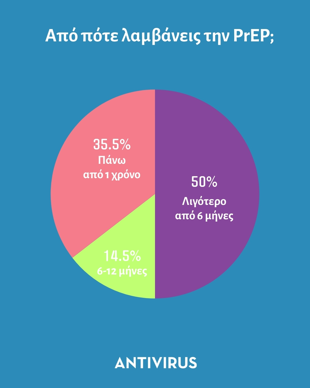 Η έρευνα δείχνει αυξητική τάση ως προς τη λήψη της PrEP, καθώς το 50% των χρηστών έχει ξεκινήσει τους τελευταίους έξι μήνες. Παράλληλα, περίπου οι μισοί χρήστες τη λαμβάνουν για πάνω από ένα χρόνο, υποδεικνύοντας ότι πρόκειται για συνειδητή και διαρκή επιλογή και όχι για προσωρινή δοκιμή.