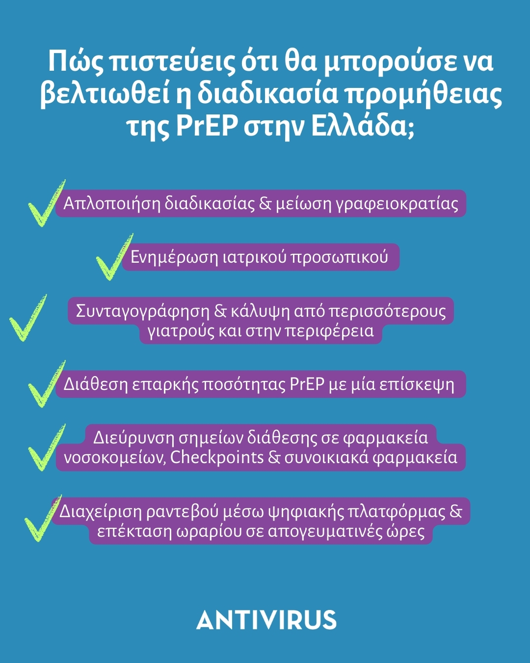 Οι χρήστες προτείνουν την αποκέντρωση της διάθεσης της PrEP, ζητώντας περισσότερα σημεία όπως φαρμακεία και Checkpoints, καθώς και την εισαγωγή ψηφιακών ραντεβού για απλούστερες διαδικασίες.