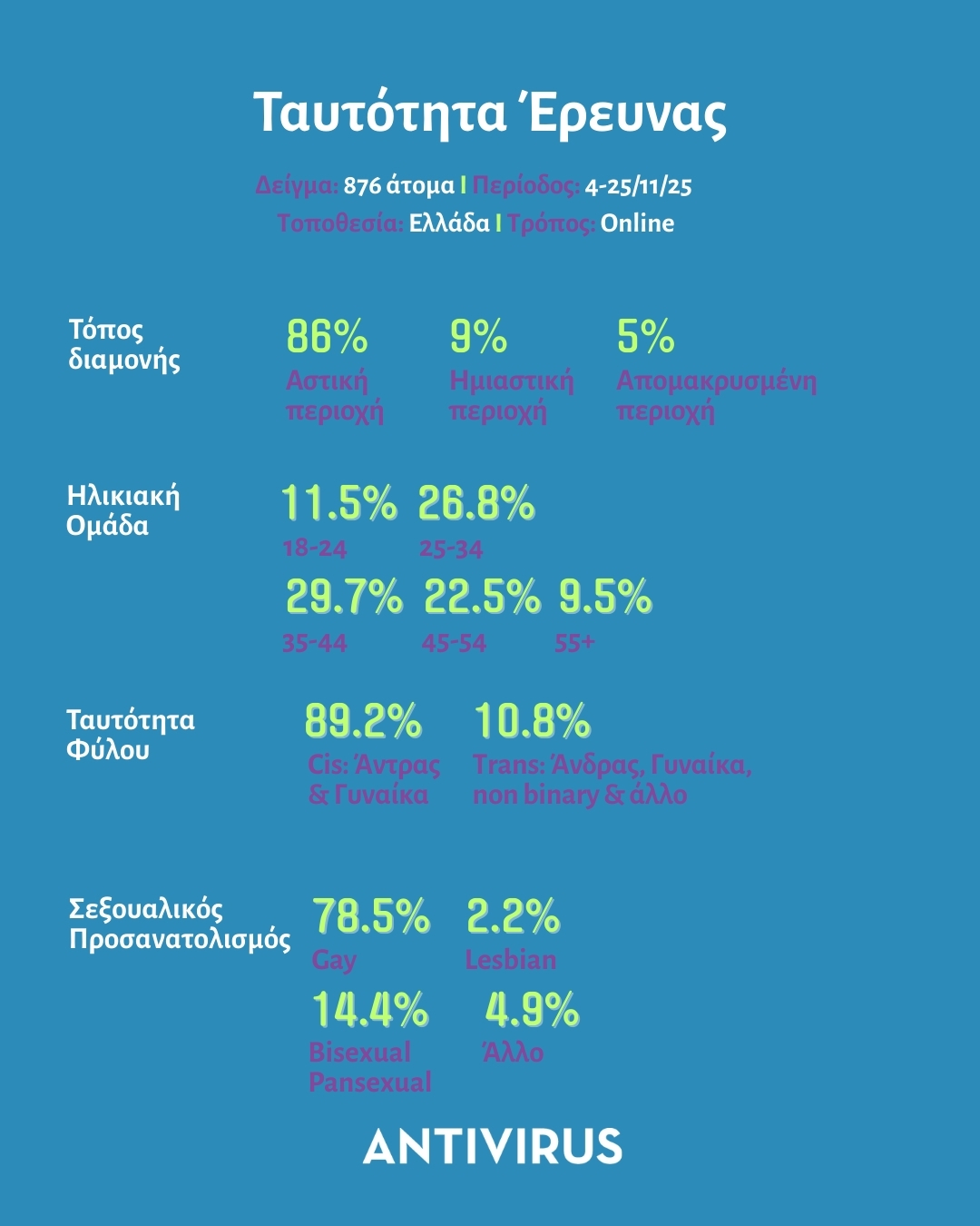 Το δείγμα της έρευνας είναι κυρίως αστικό και περιλαμβάνει κυρίως cis άνδρες που αυτοπροσδιορίζονται ως gay, ηλικίας 25–44 ετών. Τα ευρήματα αντικατοπτρίζουν ενεργά τις εμπειρίες της ΛΟΑΤΚΙ+ κοινότητας στην Ελλάδα και προήλθαν μέσω των καναλιών επικοινωνίας του ANTIVIRUS, της Θετικής Φωνής, των Checkpoints και της εφαρμογής Grindr, εξασφαλίζοντας άμεση πρόσβαση σε άτομα που βρίσκονται σε επαφή με θέματα που αφορούν σε HIV και PrEP.