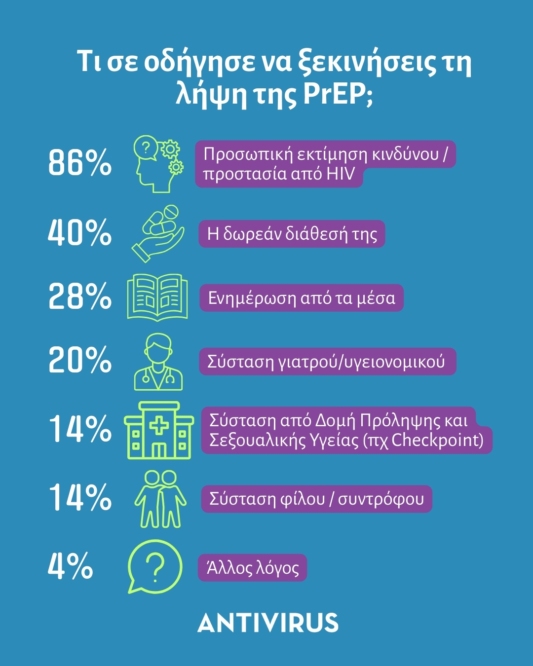 Η προσωπική ευθύνη αναδεικνύεται ως το βασικό κίνητρο για την έναρξη της PrEP (86%), ενώ η δωρεάν διάθεση αποτελεί τον δεύτερο πιο σημαντικό παράγοντα (40%). Η ενημέρωση, το ιατρικό προσωπικό και τα Checkpoints λειτουργούν υποστηρικτικά στην απόφαση των χρηστών.