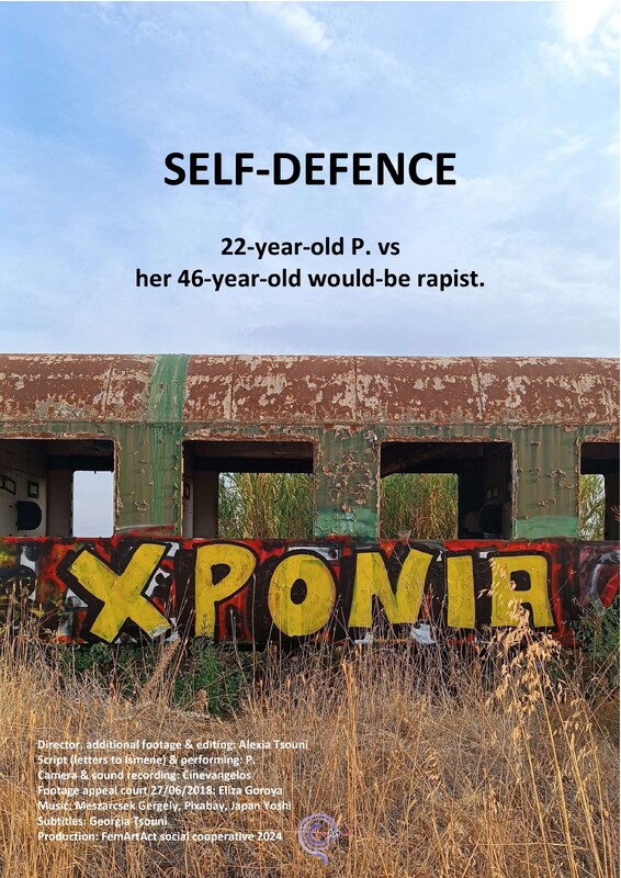 Η ταινία “Αυτοάμυνα” είναι παραγωγής FemArtAct (2024) και παρουσιάζει την αληθινή ιστορία του 22χρονου Π. (σ.σ. τρανς άνδρας) εναντίον του 46χρονου επίδοξου βιαστή της. Παρότι τον σκότωσε σε αυτοάμυνα, καταδικάζεται σε πολυετή φυλάκιση. Μέσα από τη φυλακή αρχίζει αλληλογραφία με μία από τις αλληλέγγυες που την υποστηρίζουν. Σιγά-σιγά εκφράζει όσα βιώνει στη φυλακή, αλλά και στο σώμα και την ψυχή του, με αποκορύφωμα την αποκάλυψη της πραγματικής σεξουαλικής ταυτότητας και του καταπιεσμένου κοινωνικού φύλου. Η αποδοχή που βρίσκει από την αλληλέγγυα είναι κομβικής σημασίας. Έτσι, ενώ βρίσκεται στη μέση της έκτισης της ποινής φυλάκισης, έχει ήδη απελευθερωθεί από τα εσωτερικά δεσμά του παρελθόντος, και ξαναγεννιέται ως ο Π., όπως και αυτοπροσδιορίζεται στο εξής. Ο Π. αποφυλακίστηκε τελικά το 2023. Ήρθε ο ίδιος και μου ζήτησε να κάνω ντοκιμαντέρ την ιστορία του. Μου είπε για τα γράμματα που έγραφε, τα οποία ευτυχώς τα βρήκαμε από την αλληλέγγυα. Τα ενέταξα στο σενάριο της ταινίας, με τη δική του αφήγηση μάλιστα, για να δώσω φωνή στις δικές του σκέψεις, στα δικά του συναισθήματα, στις δικές του αγωνίες και ελπίδες. Το θερμό χειροκρότημα που λάβαμε, τόσο στην πρεμιέρα της ταινίας, όσο και στις επόμενες προβολές της στην Ελλάδα και στο εξωτερικό, μας γεμίζει κι εμάς ελπίδα για έναν κόσμο με μεγαλύτερη ελευθερία κι αποδοχή του Π. και του κάθε Π..