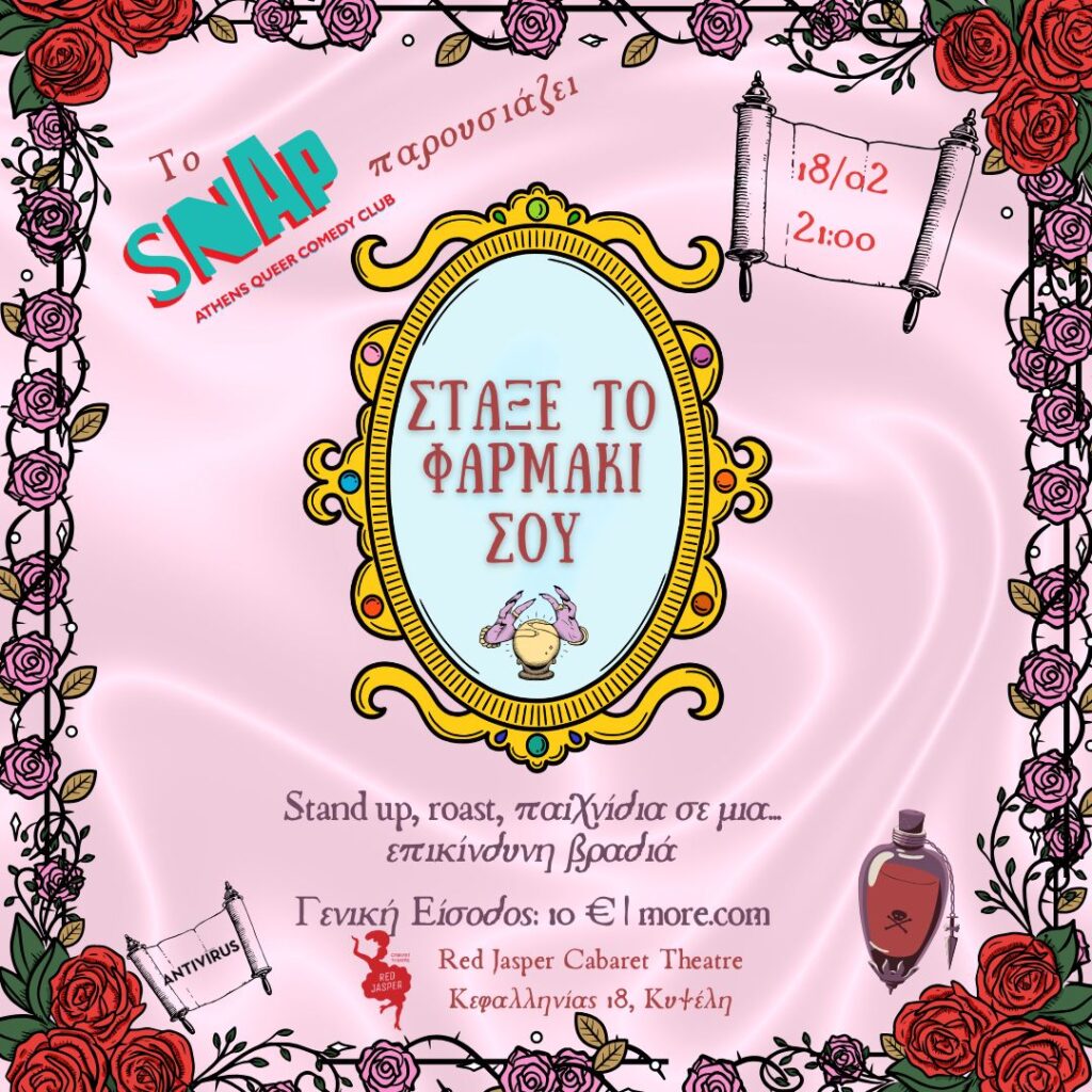 Το Snap – Athens Queer Comedy Club παρουσιάζει μια ολοκαίνουργια, άγρια και παιχνιδιάρικη παράσταση που συνδυάζει stand‑up comedy, roast και παιχνίδια με το κοινό σε έναν δηλητηριώση συνδυασμό.