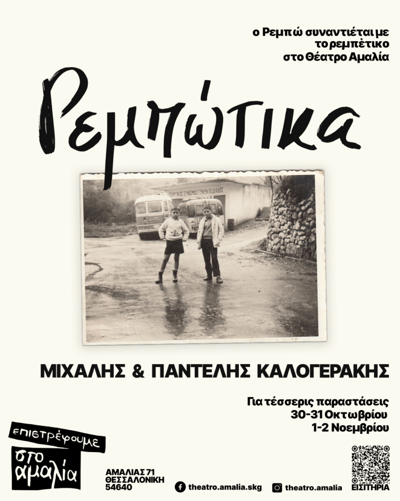 Τα Ρεμπώτικα από τους αδερφούς Καλογεράκη έρχονται στο θέατρο Αμαλία, στη Θεσσαλονίκη στις 30 και 31 Οκτωβρίου και 1 και 2 Νοεμβρίου 2025.