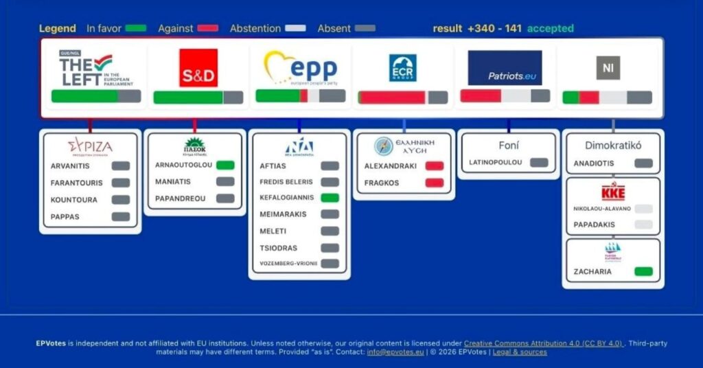 Σύμφωνα με φωτογραφία που ανάρτησε ο ακροδεξιός της Ελληνικής Λύσης, Κυριάκου Βελόπουλου, το ψήφισμα ενέκριναν μόνο δύο βουλευτές και βουλεύτριες. Ο ευρωβουλευτής του ΠΑΣΟΚ, Σάκης Αρναούτογλου, ο ευρωβουλευτής της Νέας Δημοκρατίας, Μανώλης Κεφαλογιάννης και η ευρωβουλεύτρια της Πλεύσης Ελευθερίας, Μαρία Ζαχαρία.