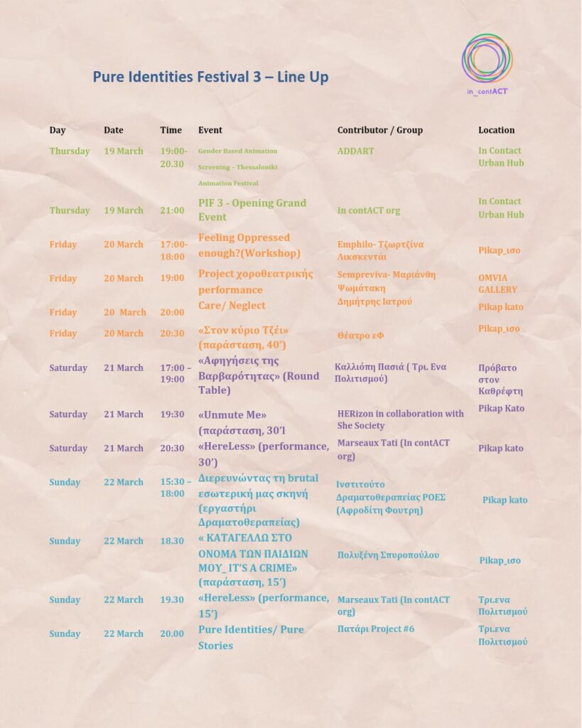 Περισσότερες πληροφορίες για το πρόγραμμα, τους συνεργαζόμενους φορείς και τ@ συμμετέχοντα@ στο Φεστιβάλ μπορείτε να βρείτε στο σύνδεσμο:Pure Identities Festival 3 || In contACt org