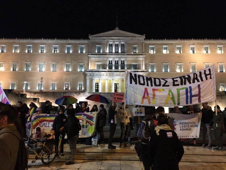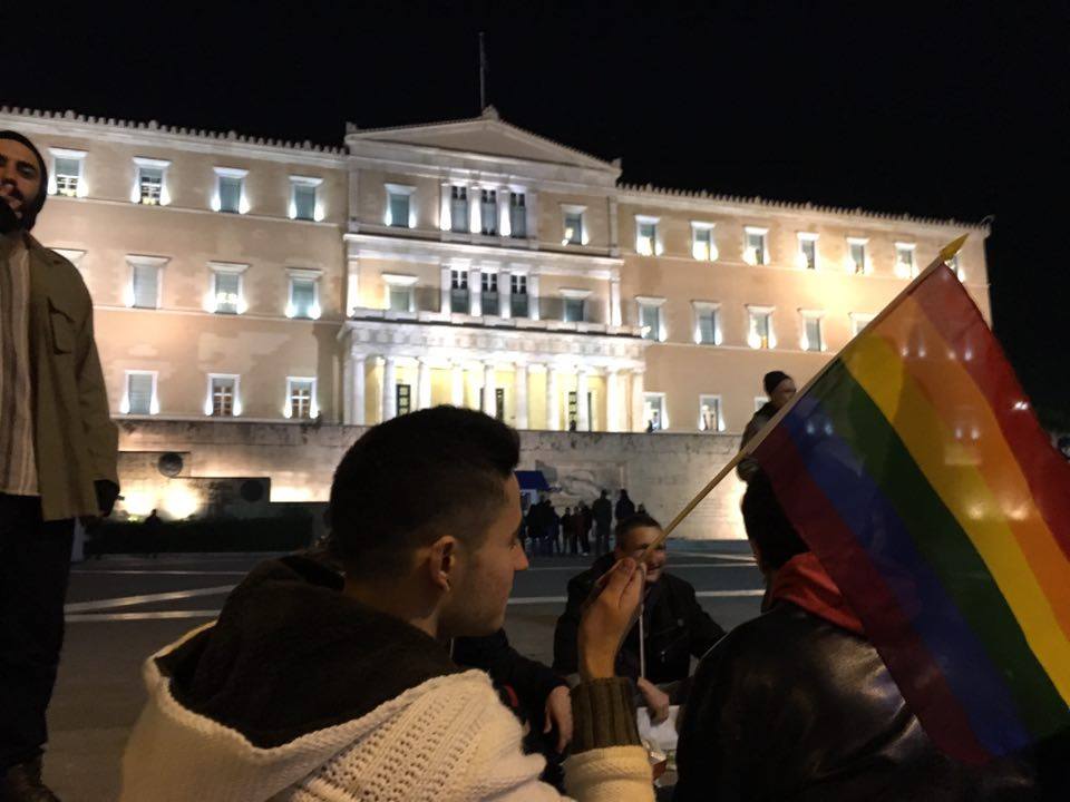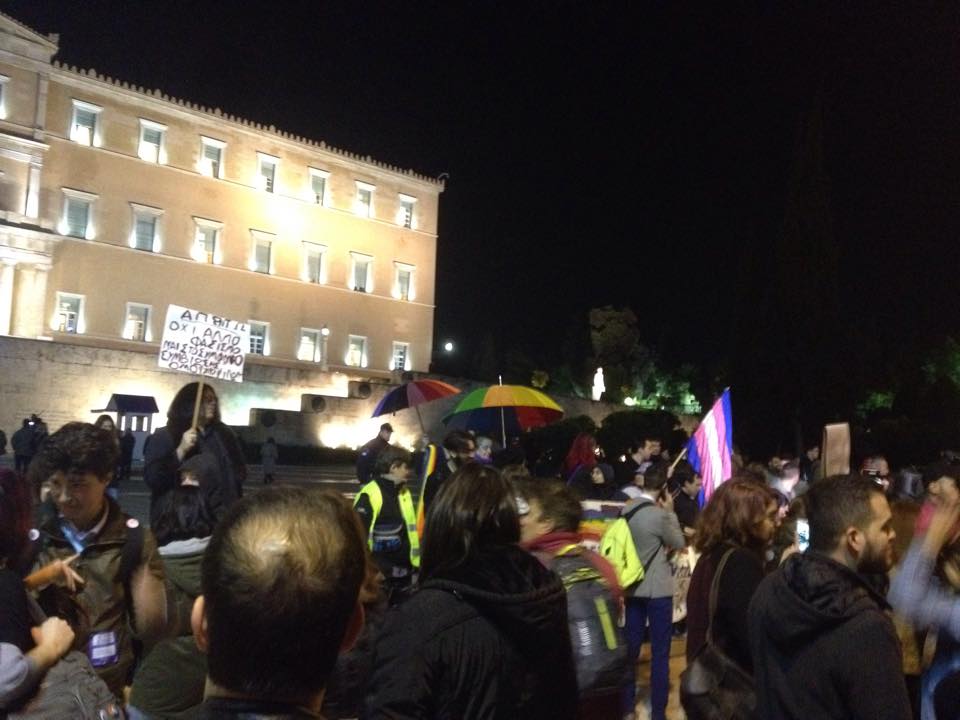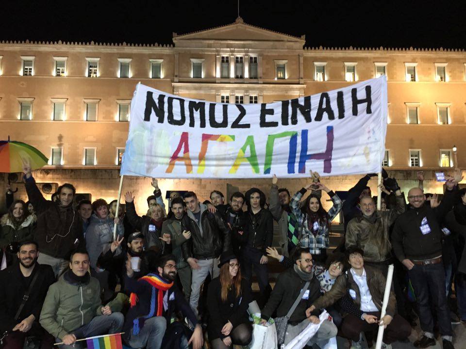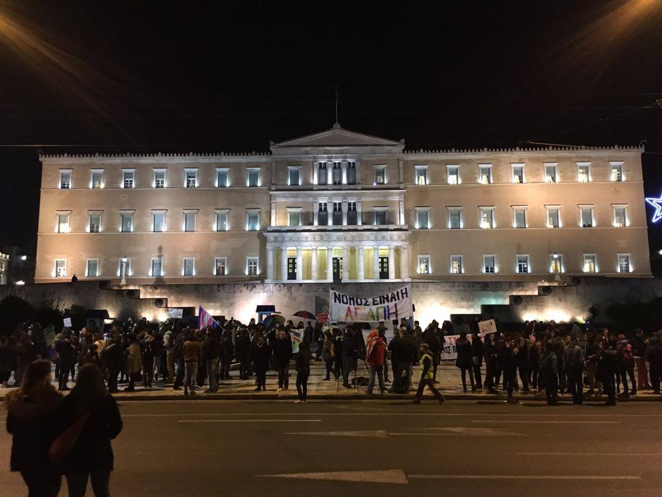 Πλήθος κόσμου είναι συγκεντρωμένος αυτή τη στιγμή έξω από τη Βουλή, δηλώνοντας ανοιχτά την υποστήριξή του σε μια Ελλάδα που τάσσεται υπέρ του συμφώνου, σε μια Ελλάδα που λέει όχι στις διακρίσεις.