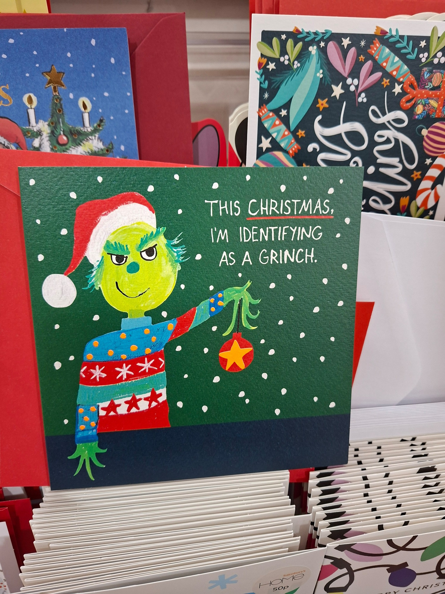 Η κάρτα, που δημιουργήθηκε από την Emotional Rescue σε συνεργασία με την Paper Salad, εντοπίστηκε σε κατάστημα Sainsbury’s Berryden στο Ηνωμένο Βασίλειο από τη δημοσιογράφο Sophie Molly. Στην τιμή των £2,75, η κάρτα έδειχνε τον Grinch με καπέλο του Άγιου Βασίλη και πολύχρωμο πουλόβερ, με τη λεζάντα: «Αυτό τα Χριστούγεννα, προσδιορίζομαι ως Grinch».