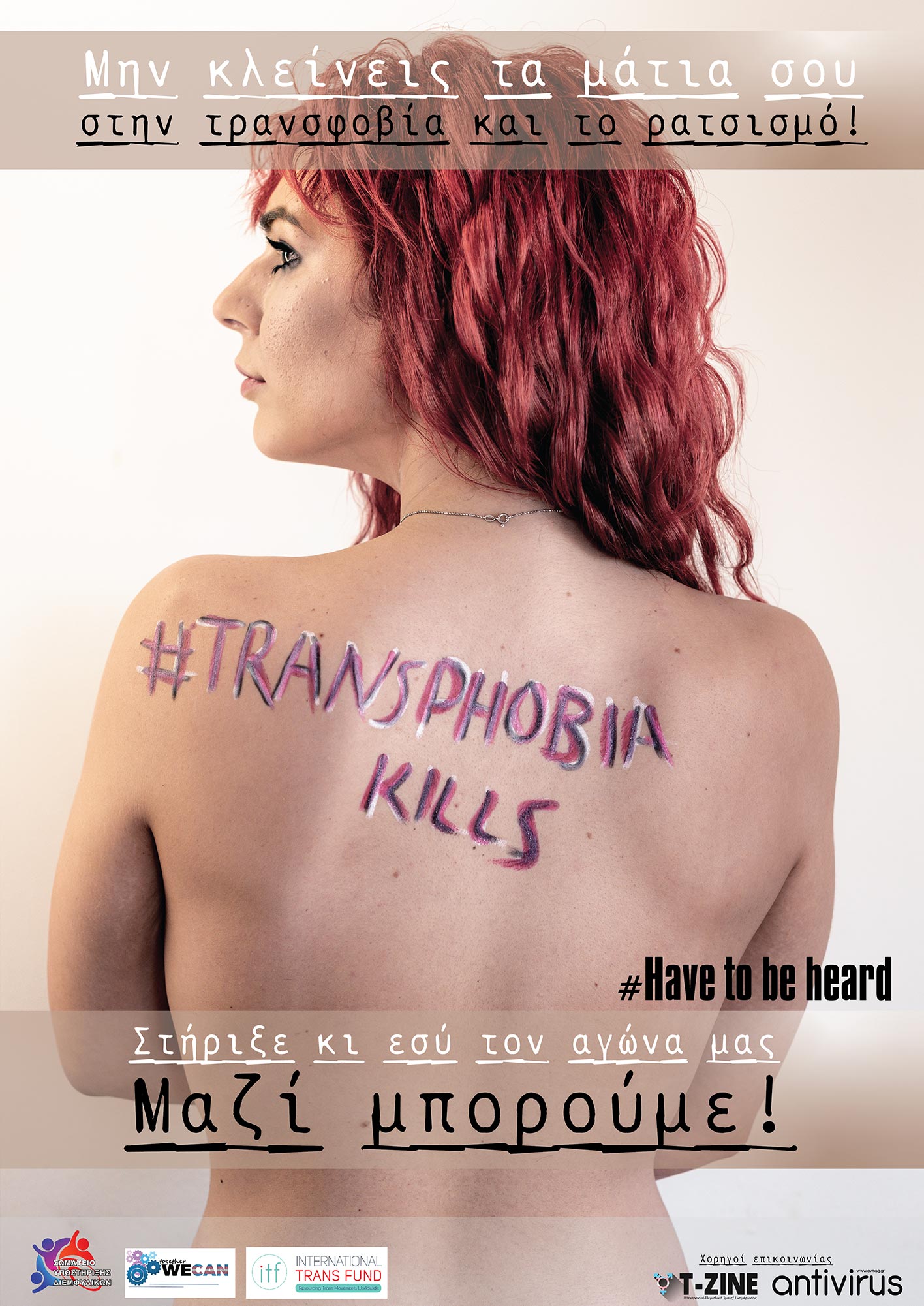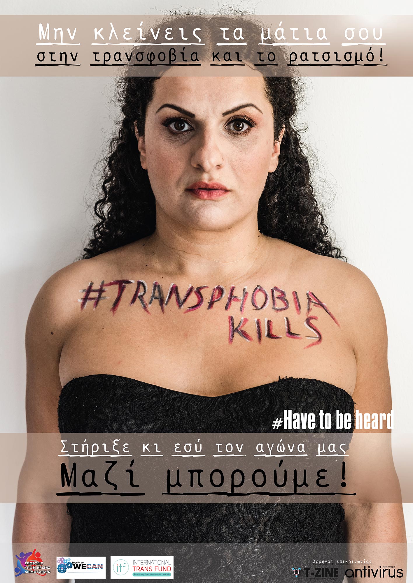 Το «Have To Be Heard – Transphobia Kills» είναι η νέα καμπάνια* που τρέχει από το Σωματείο Υποστήριξης Διεμφυλικών (Σ.Υ.Δ.) και έχει ως στόχο την ευαισθητοποίηση της κοινωνίας για τα πολλαπλά προβλήματα που αντιμετωπίζουν καθημερινά οι τρανς άνθρωποι και συγκεκριμένα την καταπολέμηση της τρανσφοβίας, των αποκλεισμών, των διακρίσεων και της περιθωριοποίησης που βιώνουν οι τρανς, φυλοδιαφορετικοί και ίντερσεξ άνθρωποι σε όλο το φάσμα της ιδιωτικής αλλά και κοινωνικής τους ζωής.
